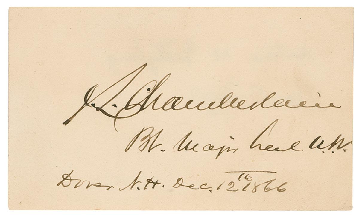 Maine-born Union major general (1828–1914) who was awarded the Congressional Medal of Honor for his defense of Little Round Top at Gettysburg. He later served as Governor of Maine and president of Bowdoin College. Ink signature, “J. L. Chamberlain, Bt. Maj Genl. U.S.A., Dover NH, Dec. 12th, 1866,” on an off-white 3.25 x 2 slip. In fine condition, with some mild toning. A particularly clean and lengthy example.