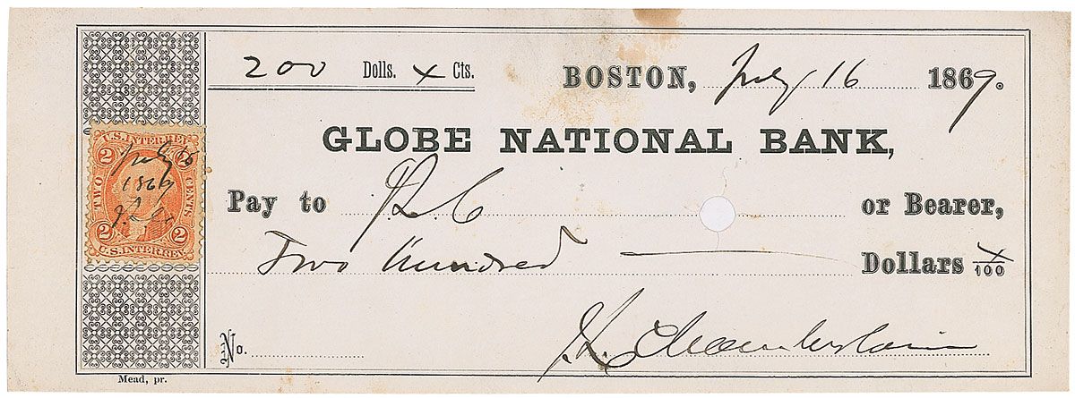 Bank check, 7.5 x 2.75, filled out and signed by Chamberlain, payable to” JLC” for $200.00, July 16, 1869. Check also bears a two-cent revenue stamp, dated and initialed by Chamberlain. A punch and staple hole to body, some scattered toning, and a trivial brush to beginning of signature, otherwise fine condition.