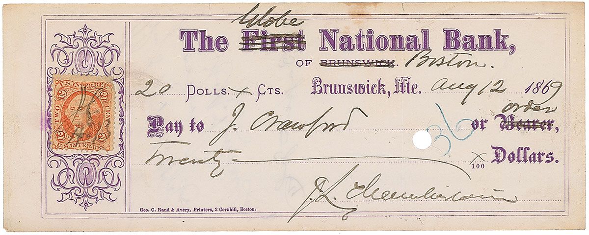 Bank check, 7.5 x 3, filled out and signed by Chamberlain, “J. L. Chamberlain,” payable to J. Crawford or order for $20.00, August 12, 1869. A two-cent revenue stamp is affixed to the left, initialed by Chamberlain, “JC.” A few light vertical folds, a couple passing through single letters of signature, punch hole to body, and some light toning to edges, otherwise fine condition.