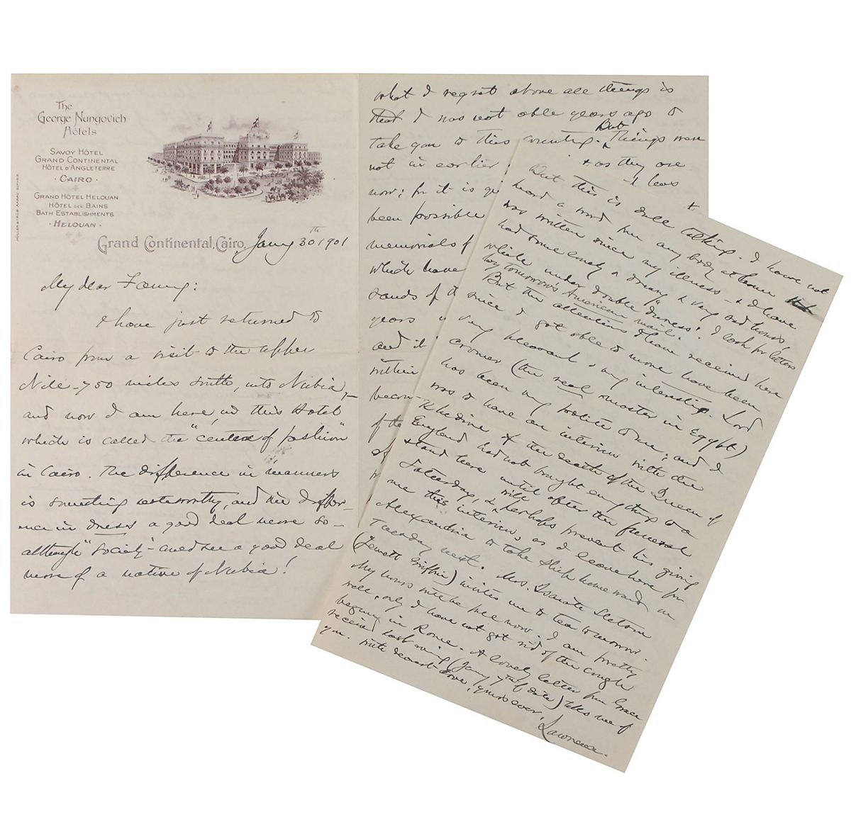 Maine-born Union major general (1828–1914) who was awarded the Congressional Medal of Honor for his defense of Little Round Top at Gettysburg. He later served as Governor of Maine and president of Bowdoin College. ALS signed “Lawrence,” six pages on two adjoining sheets and one additional sheet, 5.5 x 8.5, Grand Continental Hotel, Cairo letterhead, January 30, 1901. Letter to his wife. In part: “I have just returned to Cairo from a visit to the upper Nile—750 miles South, into Nubia…it is quite of late that it has been possible to see & explore the vast memorials of ancient Egypt many of which have been buried in the sweeping sands of the deserts for thousands of years…In my journey ‘by Nile boat’ up & down this mighty, historic river, I have been able to see nearly all that has been opened to human view on both shores, riding camel-back or donkey-back, ten to twenty miles over the desert to see the wonders & threading underground tomb passages like labyrinths, or catacombs, with candles & magnesium lights to see what pains these earnest people of thousands of years ago took to keep their bodies safe & ready for the return of the soul to them, so they earnestly believed…I was to have an interview with the Khedive if the death of the Queen of England [Victoria on Jan. 22, 1901] had not brought everything to a stand here until after the funeral.” In fine condition. Accompanied by a color photocopy of the original mailing envelope.