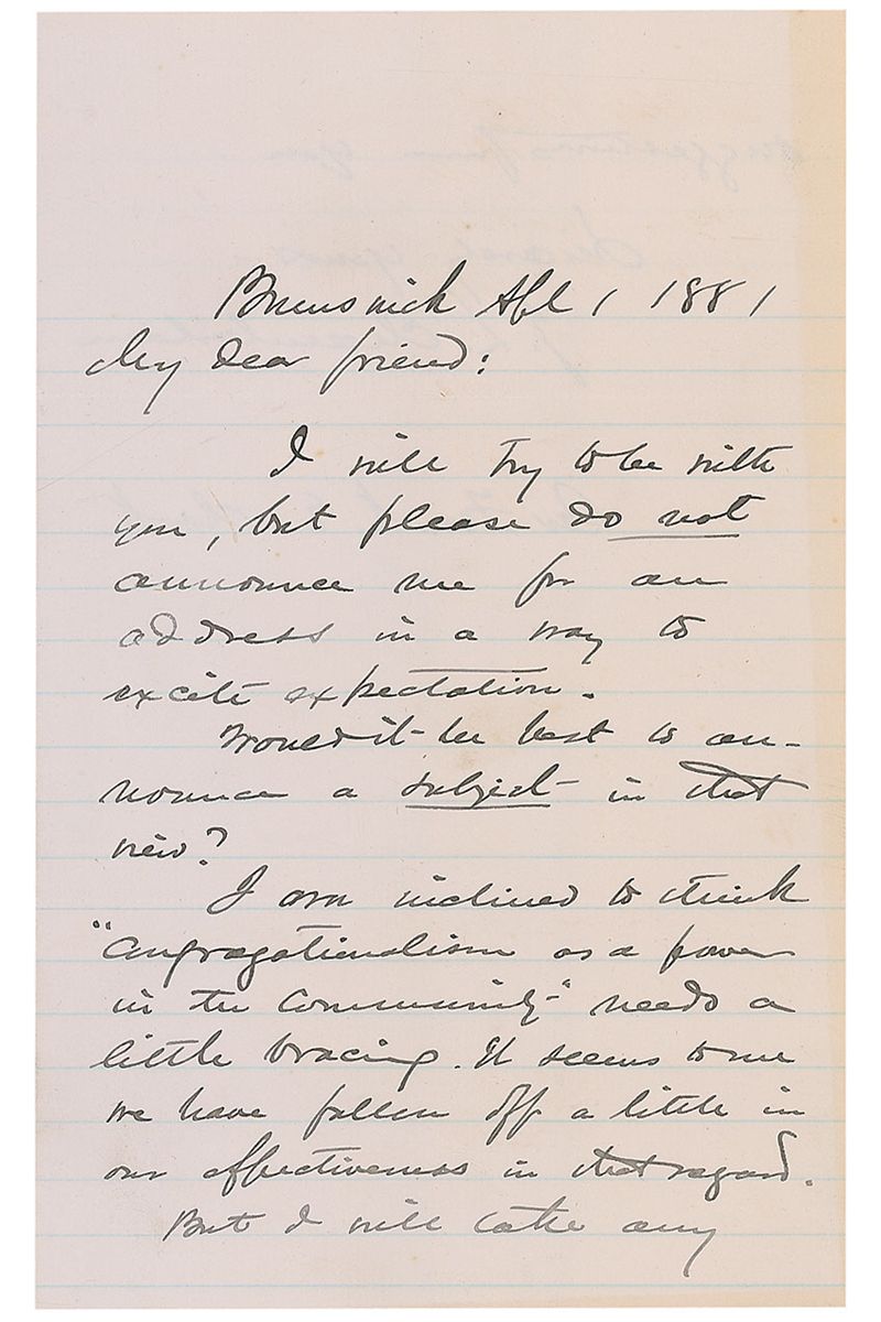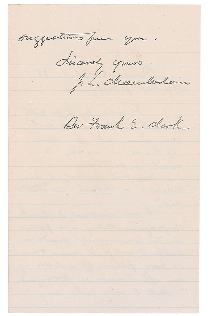 Maine-born Union major general (1828–1914) who was awarded the Congressional Medal of Honor for his defense of Little Round Top at Gettysburg. ALS signed “J. L. Chamberlain,” one page, lightly-lined, 5 x 8, April 1, 1881. Letter to Francis Edward Clark. In part: “I will try to be with you, but please do not announce me for an address in a way to excite expectation. Would it be best to announce a subject in that view? I am inclined to think ‘Congregationalism as a power in the Community’ needs a little bracing. It seems to me we have fallen off a little in our effectiveness in that regard.” In fine condition, with a mild band of toning to the right edge of the first page.