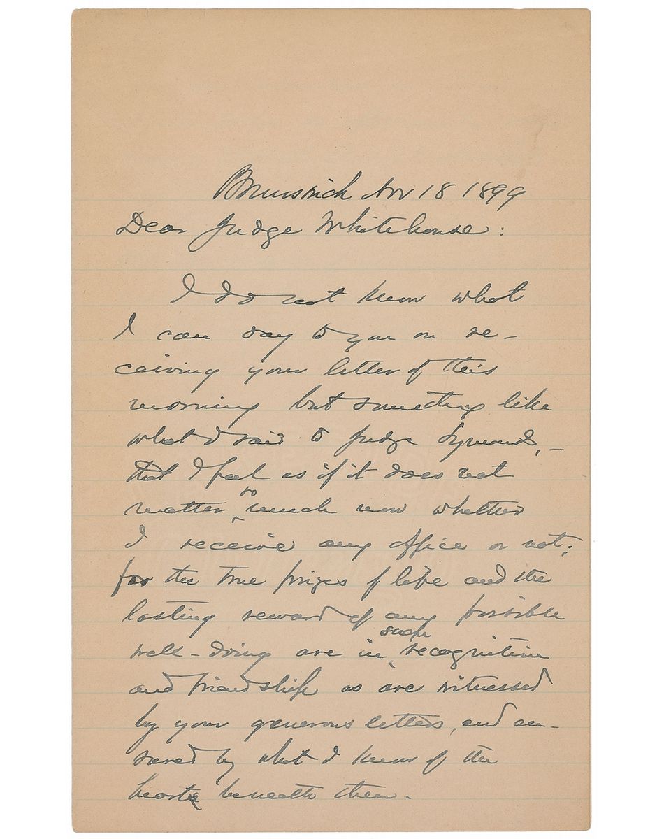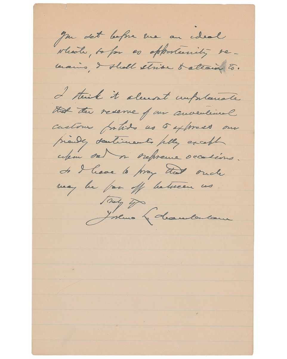 ALS signed “Joshua L. Chamberlain,” two pages, lightly-lined on two adjoining sheets, 5.75 x 9, November 18, 1899. Letter to Judge William Penn Whitehouse, a justice on the Maine Supreme Judicial Court. In full: “I do not know what I can say to you on receiving your letter of this morning but something like what I said to Judge Symonds,—that I feel as if it does not matter so much now whether I receive any office or not; for the true prizes of life and the lasting reward of any possible well-doing are in such recognition and friendship as are witnessed by your generous letters, and ensured by what I know of the hearts beneath them. You set before me an ideal which, so far as opportunity remains, I shall strive to attain to. I think it almost unfortunate that the reserve of our conventional customs forbids us to express our friendly sentiments fully except upon sad or supreme occasions so I have to pray that such may be far off between us.” In fine condition, with uniform toning. Judge Whitehouse was on the Maine Supreme Judicial Court from 1890 to 1913; the other judge mentioned, Joseph W. Symonds, had served on the court from 1878 to 1884. Chamberlain had previously served as Maine’s governor, and it is possible that this letter was in response to an inquiry about his interest in a congressional seat—Maine’s own Thomas B. Reed had resigned from Congress and his powerful position as Speaker of the House in March 1899, and his private secretary was elected to fill the vacancy.