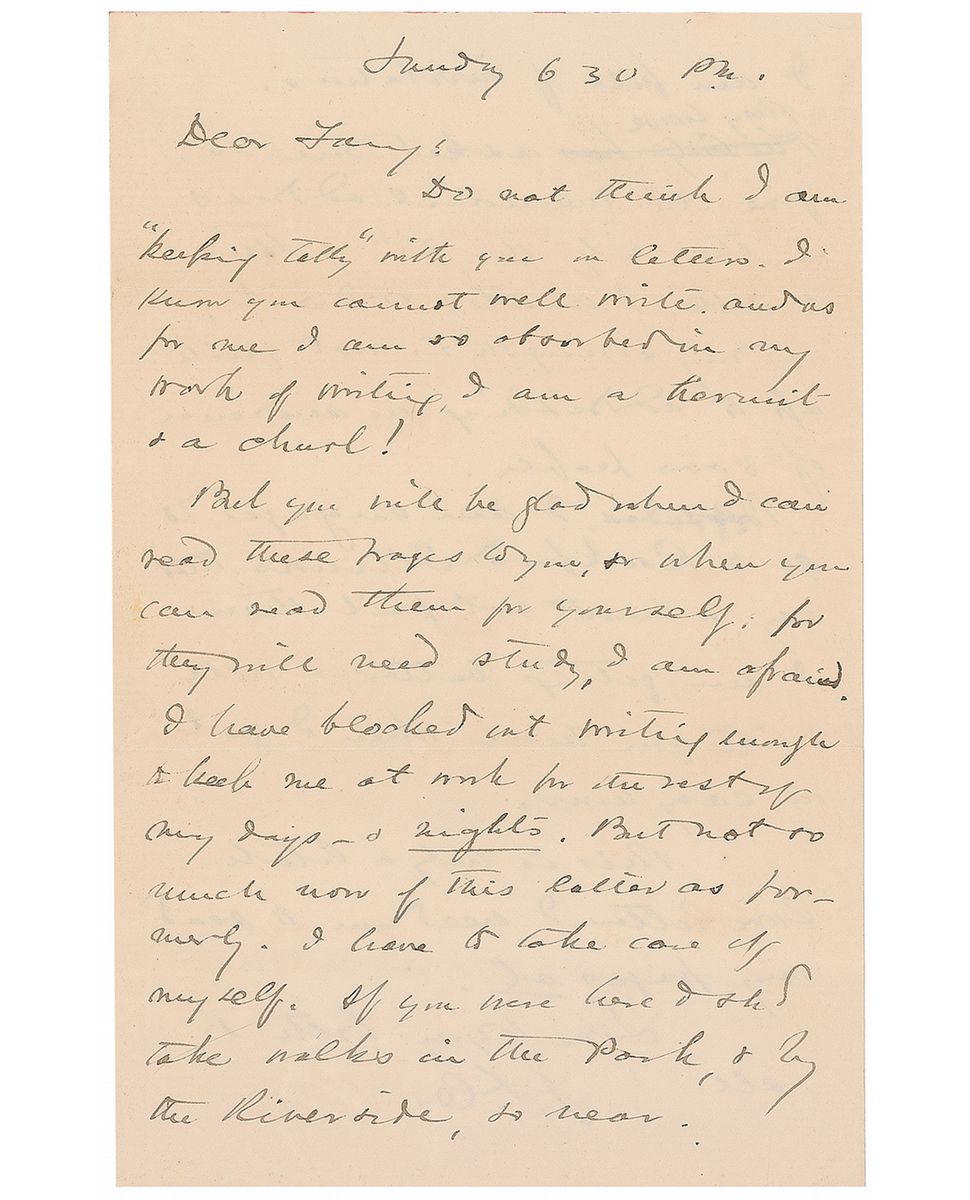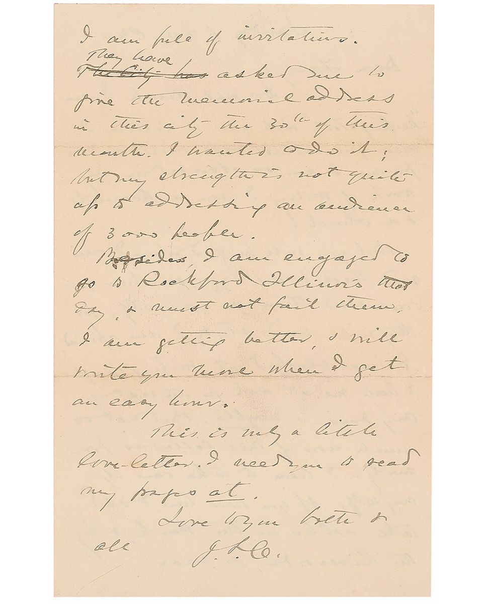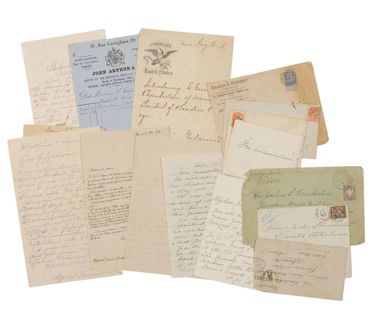 Maine-born Union major general (1828–1914) who was awarded the Congressional Medal of Honor for his defense of Little Round Top at Gettysburg. He later served as Governor of Maine and president of Bowdoin College. ALS signed “J. L. C.,” one page both sides, 5 x 7.75, no date, but postmarked May 3, 1891. Letter to his wife written from New York. In part: “Do not think I am ‘keeping tally’ with you in letters. I know you cannot well write and as for me I am so absorbed in my work of writing I am a hermit & a churl! Bet you will be glad when I can read these pages to you, & when you can read them for yourself, for they will need study, I am afraid I have blocked out writing enough to keep me at work for the rest of my days—& nights…If you were here I shd take walks in the Park, & by the River side, so near. I am full of invitations. They have asked me to give the memorial address in this city the 30th of this month. I wanted to do it; but my strength’s not quite up to addressing an audience of 3000 people. Besides, I am engaged to go to Rockford Illinois that day…I am getting better. I will invite you here when I get an easy hour. This is only a little love-letter.” In fine condition. Accompanied by a color photocopy of the original mailing envelope and a collection of 17 items including six letters (one in German and one in French), and seven envelopes, dated 1878–1900, to General or Mrs. Chamberlain.