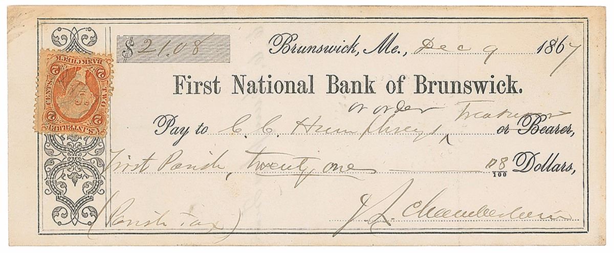 Maine-born Union major general (1828–1914) who was awarded the Congressional Medal of Honor for his defense of Little Round Top at Gettysburg. Bank check, 7 x 2.75, filled out and signed by Chamberlain, “J. L. Chamberlain,” payable to C. C. Humphreys for $21.08, December 9, 1867. Chamberlain notes that the payment is for a “Parish tax” in the lower left. In fine condition, with mild edge toning.
