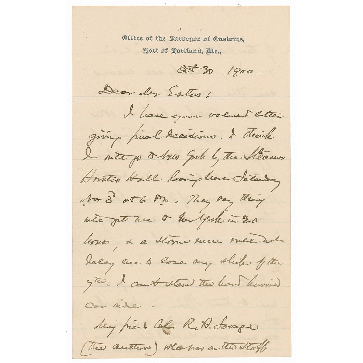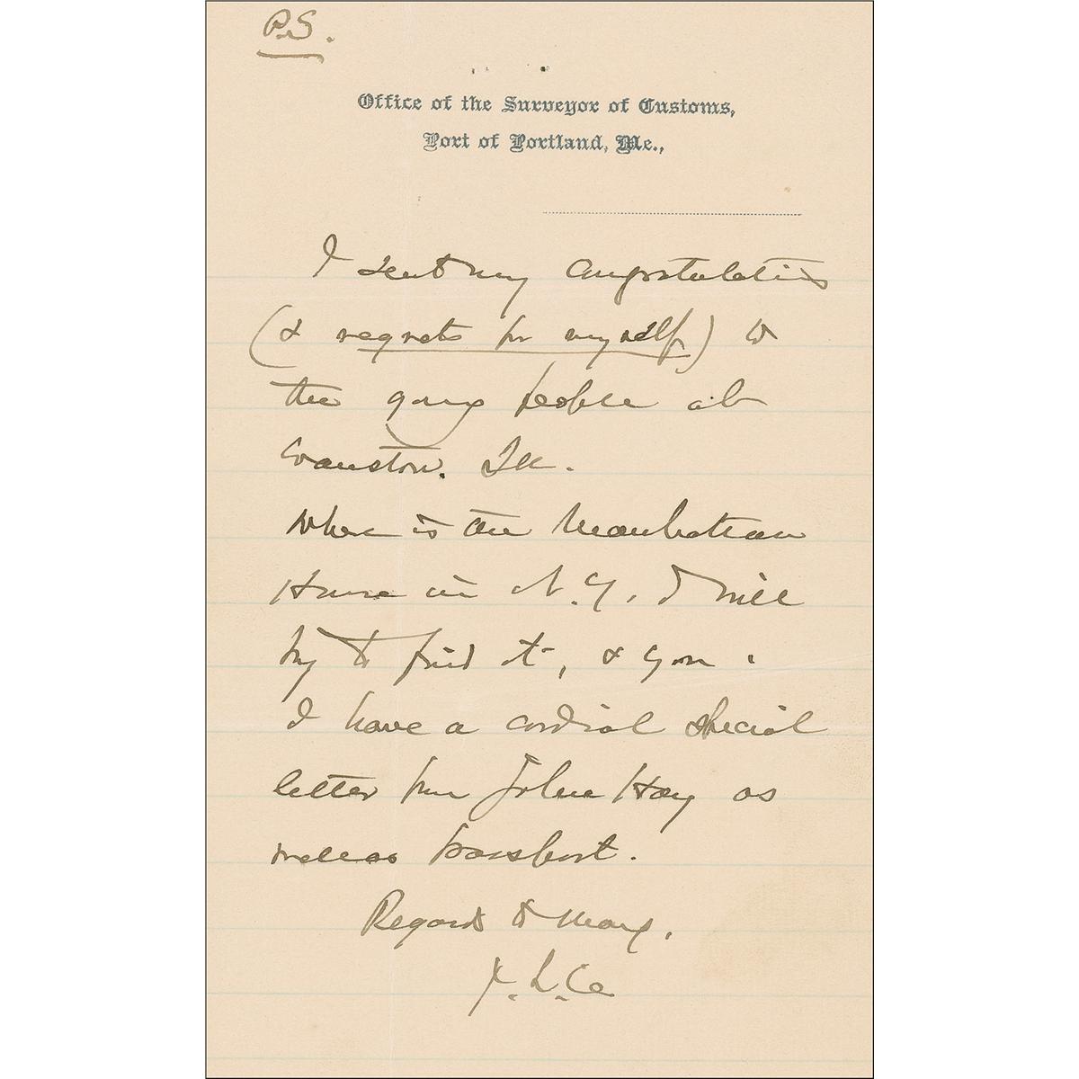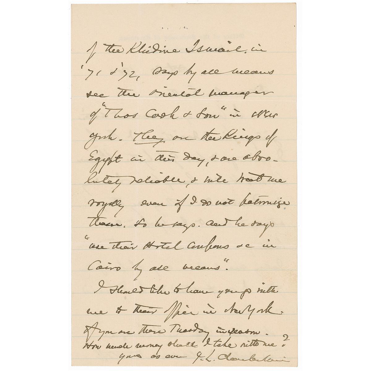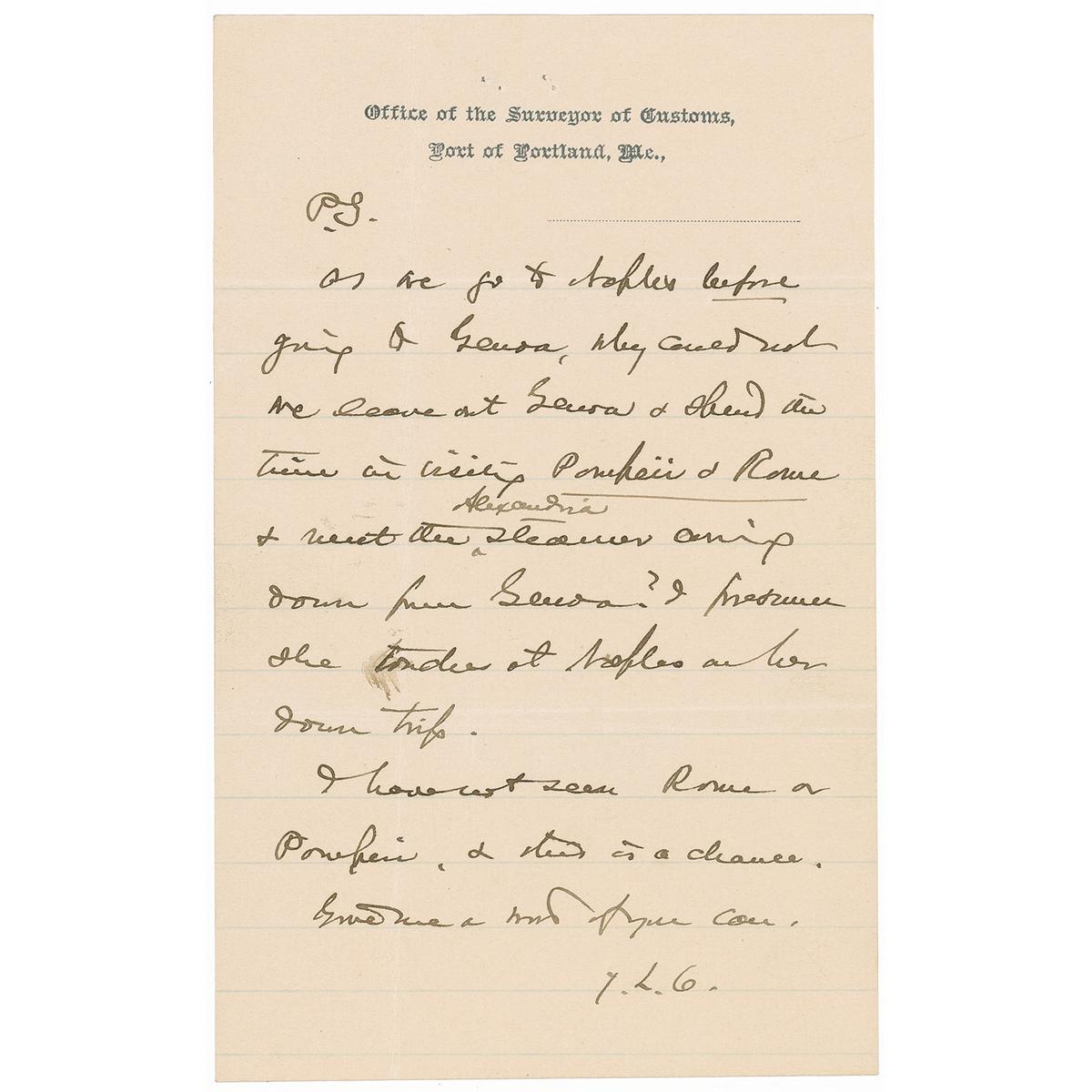 Maine-born Union major general (1828–1914) who was awarded the Congressional Medal of Honor for his defense of Little Round Top at Gettysburg. He later served as governor of Maine and president of Bowdoin College. ALS signed “J. L. Chamberlain,” on both sides of one lightly-lined page, plus two additional similar one-page pages bearing postscripts, 5 x 8, Office of the Surveyor of Customs letterhead, October 30, 1900. Letter to Dana Estes regarding an upcoming trip to Italy and Egypt. In part: “I think I will go to New York by the Steamer Horatio Hall…They say they will get me to New York in 20 hours, & a storm even will not delay me to lose my ship of the 7th. I can’t stand the hard humid car [railroad] ride. My friend Col. R. H. Savage (the author) who was on the staff of the Kliedine Ismail in ‘71 & ‘72, say by all means see the Oriental manager of ‘Thos Cook & Son’ in New York. They are the Kings of Egypt in this day, & are absolutely reliable, & will treat me royally even if I do not patronize them. So he says. And he says ‘Use their Hotel confines etc in Cairo by all means.” The third and fourth pages of this letter are actually lengthy postscripts, each signed “J.L.C.,” with one reading: “As we go to Naples before going to Genoa, why could not we leave out Genoa & spend the time visiting Pompeii & Rome & meet the Alexandria steamer coming down from Genoa? I presume she tenders at Naples on her down trip. I have not seen Rome or Pompeii, & there is a chance. Give me word if you can.” In fine condition, with intersecting mailing folds, and staple holes to top of each page.