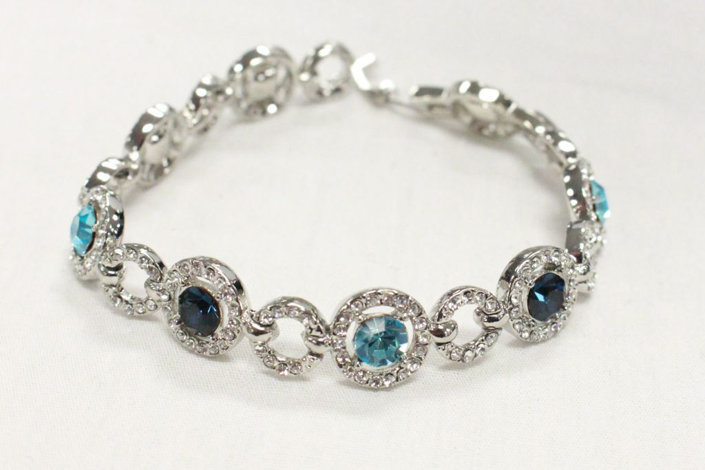 Joshua Lieff Designer Rhodium Plated Bracelet With Blue and Clear Swarovski Crystals