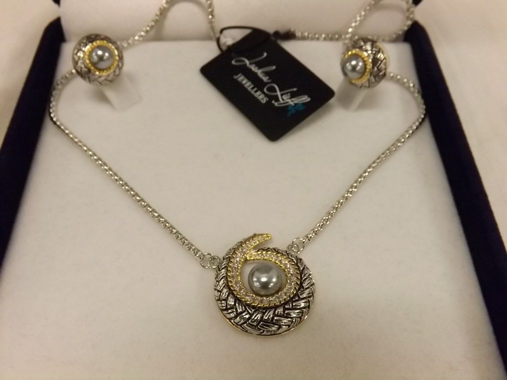 Joshua Lieff Designer Rhodium and Yellow Gold Plated Necklace/Pendant and Earrings with Clear Swarovski Crystals
