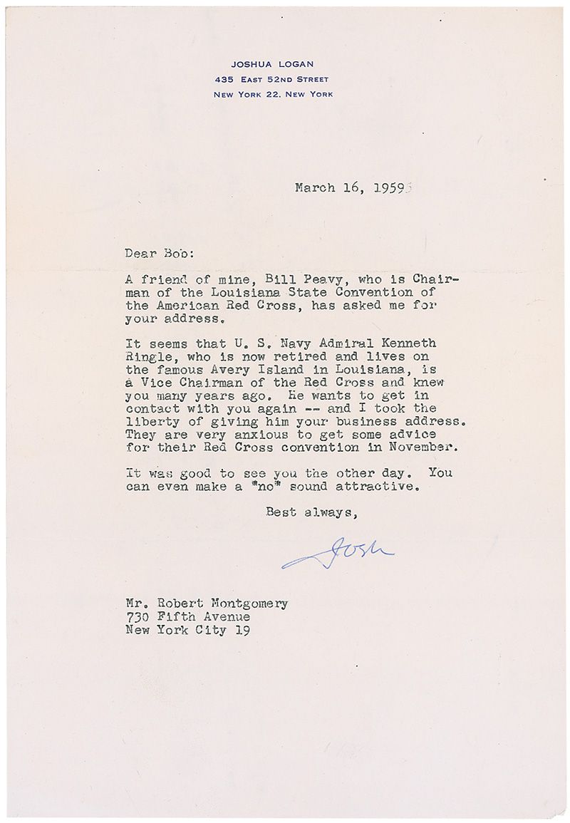 TLS signed “Josh,” one page, 7 x 10.25, personal letterhead, March 16, 1959. Letter to Robert Montgomery. In part: “It seems that U. S. Navy Admiral Kenneth Ringle, who is now retired…is Vice Chairman of the Red Cross and knew you many years ago. He wants to get in contact with you again—and I took the liberty of giving him your business address. They are very anxious to get some advice for their Red Cross convention in November. It was good to see you the other day. You can even make a ‘no’ sound attractive.” In fine condition.