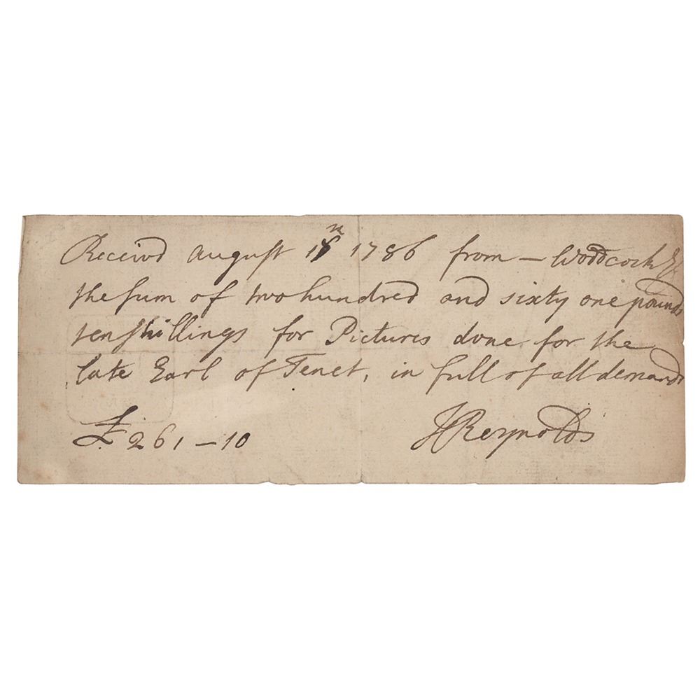 ADS, signed “J. Reynolds,†one page, 7.75 x 3, August 18, 1786. Handwritten receipt for a payment for paintings, in full: "Received August 18th 1786 from Woodcock the sum of two hundred and sixty one pounds ten shillings, for Pictures done for the late Earl of Tenet, in full of all demand." In fine condition, with light soiling and intersecting folds.