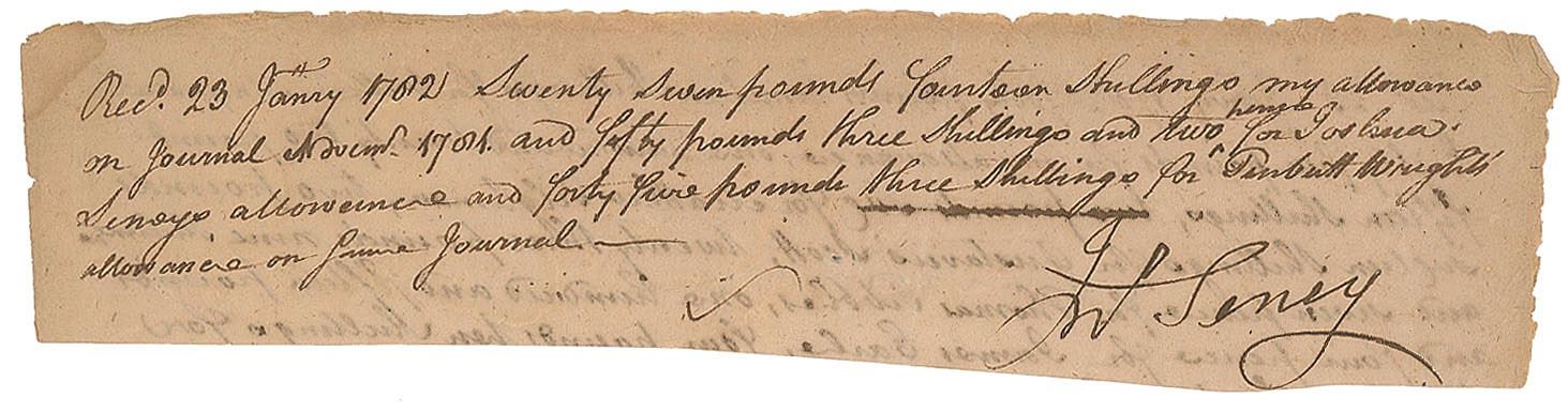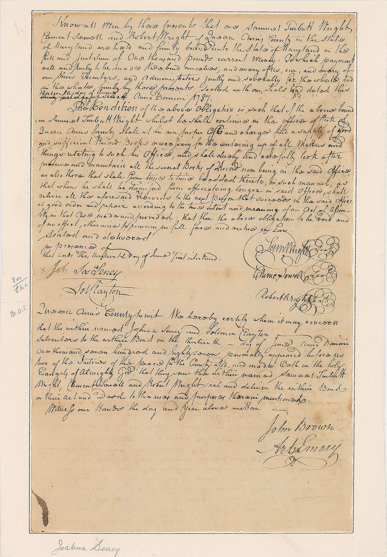 American farmer and lawyer (1756–1798) from Queen Anne's County, Maryland, who represented the state in the Continental Congress, and later served in the House of Representatives. Manuscript DS, signed “Jos'a Seney,” one page, 7.5 x 12, June 13, 1787. Bond guaranteeing that Samuel T. Wright will properly perform his duties as the clerk of Queen Ann's County, Maryland, signed at the conclusion by Seney as a witness. Other signers include Robert Wright, a Revolutionary soldier who went on to serve as senator, and later governor, of Maryland; and John Brown, later a Maryland congressman. Professionally inlaid into a slightly larger sheet and in fine condition, with a bit of foxing, and tape reinforcement to a horizontal fold. Accompanied by a small 1782 receipt signed on Joshua Seney's behalf by his father, John Seney. Joshua Seney's autograph ranks amongst the rarest of all members of the Continental Congress.