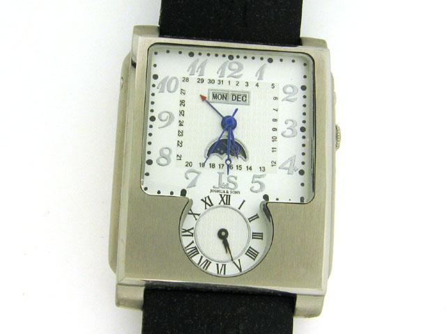 This is a Joshua and Sons Men's JS-04-02 'The Boss' Dual-Time Automatic Watch with the following features: Quality automatic movement; functions without a battery; powers automatically with the movement of your arm; Mineral crystal; Case diameter: 48 mm; Stainless-steel case; white dial; day-date-and-month-moon-phase functions; and Water-resistant to 165 feet (50 M)