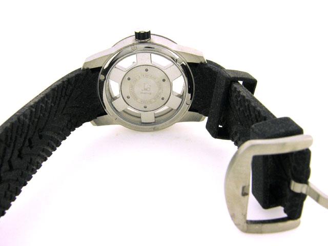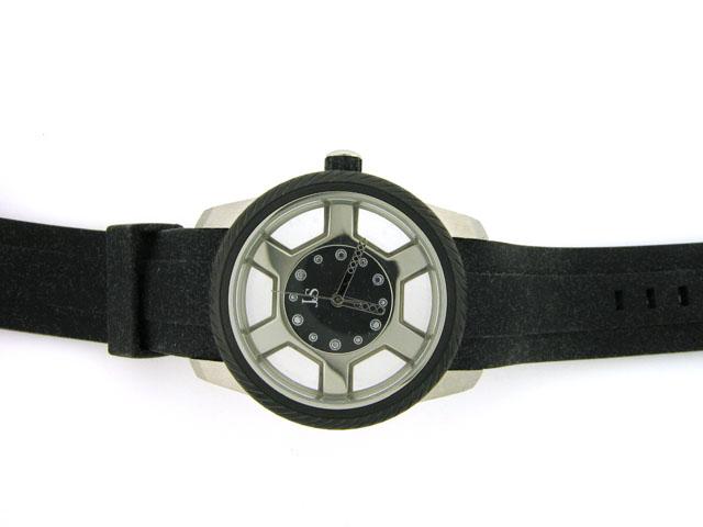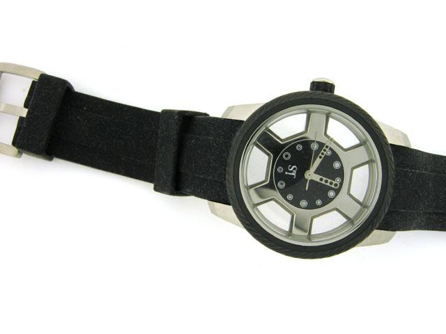 This is a Joshua & Sons Men's The HUB Silicone Watch with the following features: black, white, and silver hubcap dial and artistic tire-treaded bezel; stainless steel case; black stainless steel bezel with unique tire treading, and a black rubber wristband secured with a buckle clasp; protective mineral window shields the black-and-white dial; silver-tone hubcap overlay and complementary nuts-and-bolts hour markers; dial includes silver-tone watch hands; quartz movement; and water resistant to 330 feet (100 M).