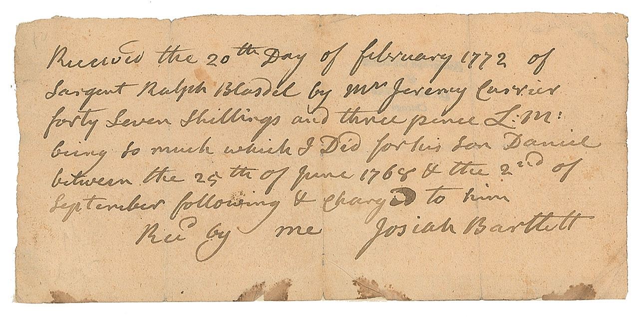 ADS, one page, 7.25 x 3.5, February 20, 1772. Handwritten financial receipt, in part: "Received the 20th Day of February 1772 of Sargent Ralph Blasdel by Mr. Jeremy Carrier forty seven shillings and three pence." Reverse bears an "Autograph Collection of Dr. Max Thorek, Chicago" stamp. In very good to fine condition, with overall creasing, stains along the bottom edge, and a tear to the bottom center repaired with old tape on the reverse.