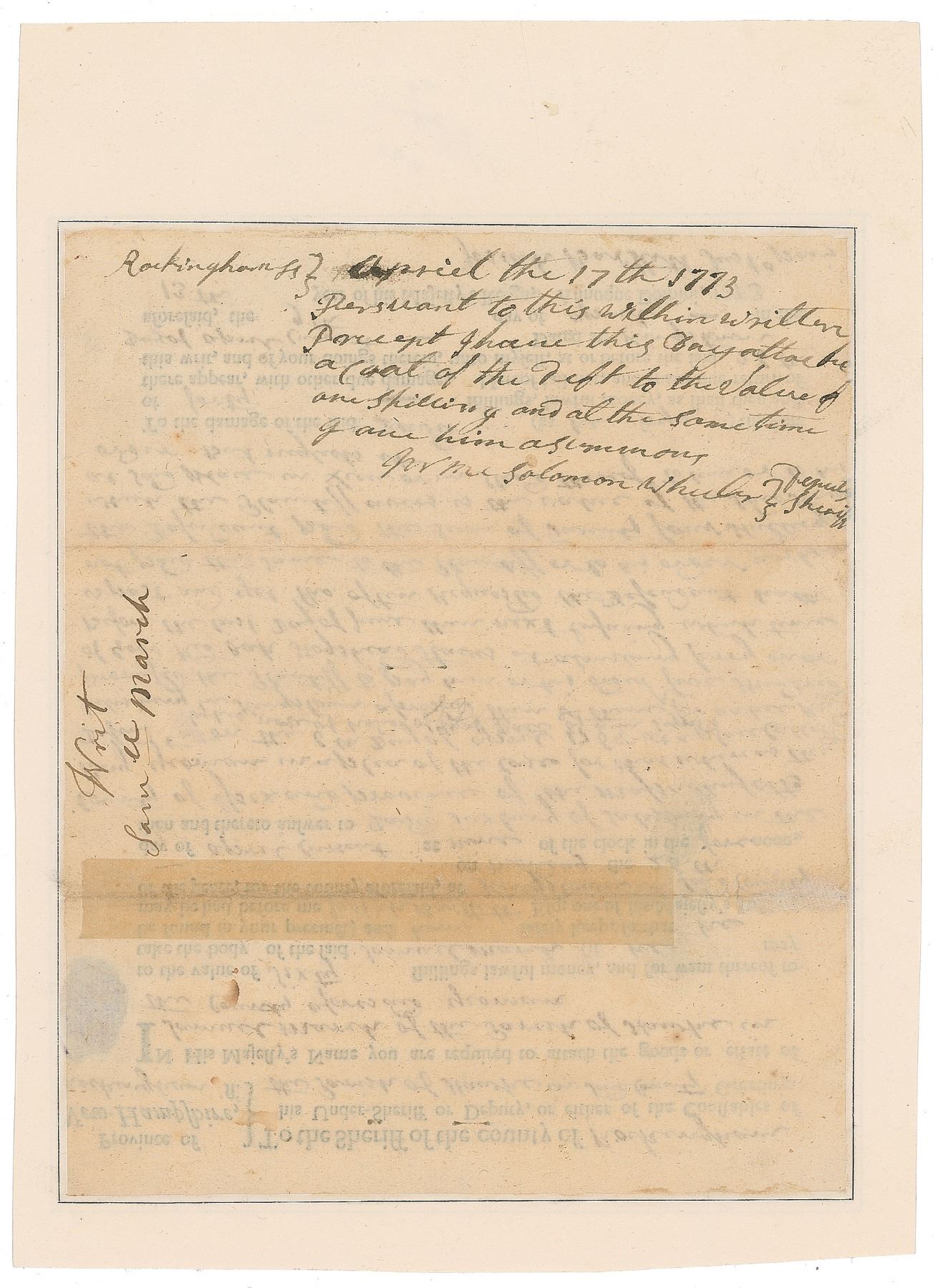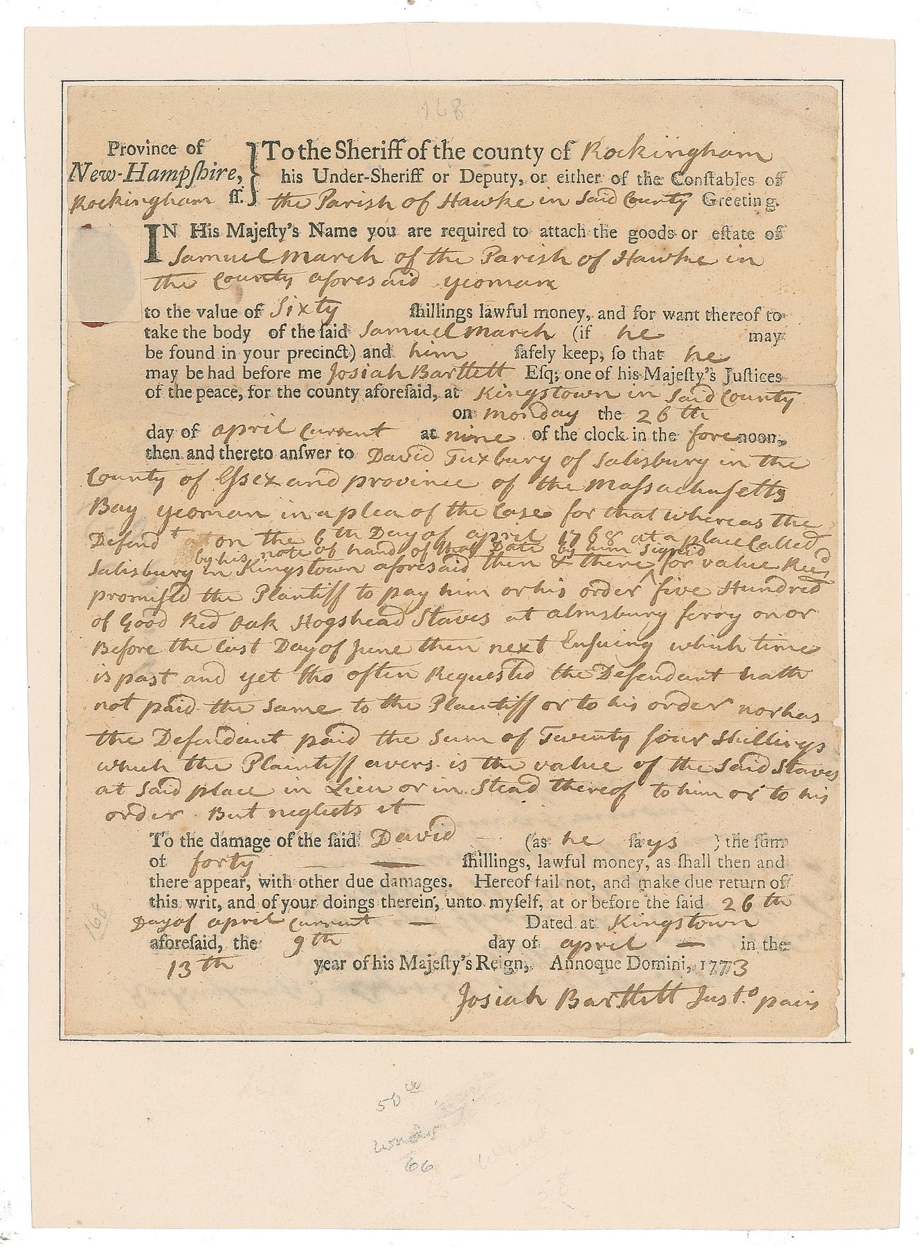 Partly-printed DS, signed “Josiah Bartlett Just. Peace,” one page, 6.25 x 7.5, April 9, 1773. Document filled out and signed within the text by Bartlett, and signed again at the conclusion. In part: "To the Sheriff of the county of Rockingham…In His Majesty's Name you are required to attach the goods or estate of Samuel March…to the value of sixty shillings lawful money, and for want thereof to take the body of the said Samuel March (if he may be found in your precinct) and him safely keep, so that he may be had before me Josiah Bartlett Esq; one of his Majesty's Justices of the peace…and thereto answer to David Tuxbury of Salisbury…in a plea." Inlaid into a slightly larger sheet and in fine condition, with old tape on the back of one fold split.