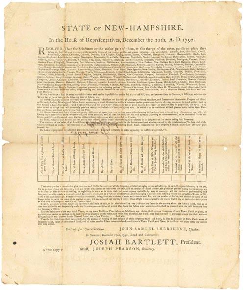 Signer of the Declaration of Independence, Josiah Bartlett document signed as Governor (then called President) of New Hampshire, dated 11 December 1792. Document details inventory of real estate, number of cows and horses, yearly rent on mills, and more. Bartlett's signature is in black ink, signed upside-down, at center of document. Document, measuring 12'' x 14.5'', has splits from folding repaired on verso. Excellent signature by Bartlett. Overall very good condition.