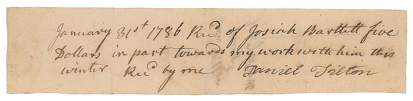 Third-person ADS, signed within the text, "Josiah Bartlett," one page, 7.25 x 1.5, January 31, 1786. Payment receipt, which reads: "Rec'd of Josiah Bartlett five Dollars in part towards my work with him this winter. Rec'd by me." Signed at the conclusion by Daniel Tilton, a New Hampshire and one of the three first judges of the Mississippi Territory Supreme Court, who was also the deliverer of the first Territorial Seal of Mississippi. In fine condition.