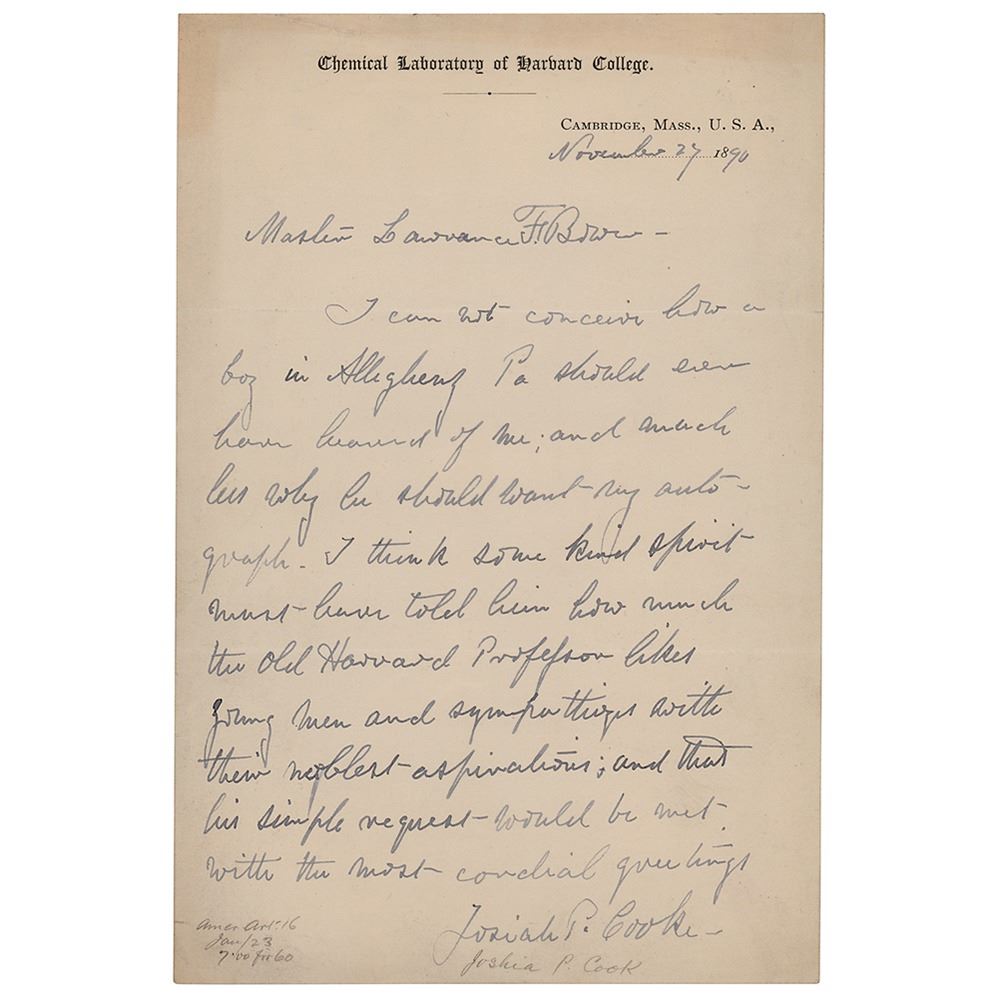 ALS signed Josiah P. Cooke, one page, 5.5 x 8.5, Chemical Laboratory of Harvard College letterhead, November 27, 1890. Handwritten letter to a young collector, in part: "I can not conceive how a boy in Allegheny Pa should even have heard of me; and much less why he should want my autograph. I think some kind spirit must have told him how much the old Harvard Professor likes young men and sympathizes with their noblest aspirations; and that his simple request would be met." In fine condition.