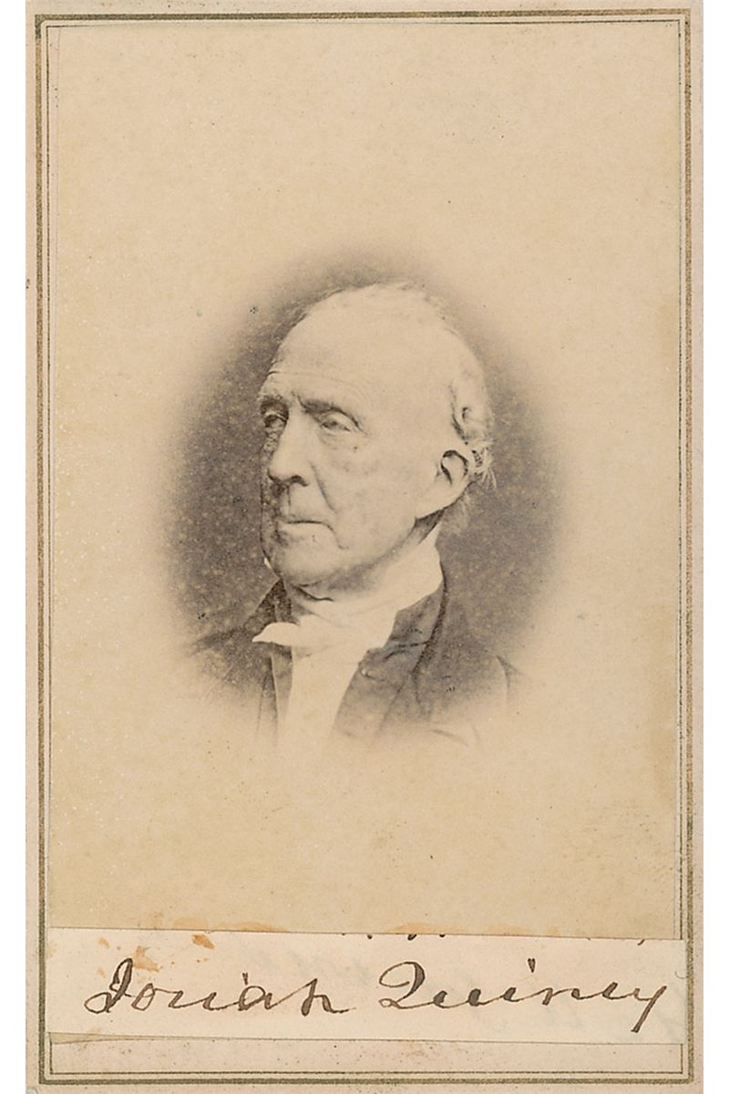 Congressman, mayor of Boston, and president of Harvard (1772–1864); Quincy Market in downtown Boston is named in his honor. Ink signature, “Josiah Quincy,” on an off-white 2.25 x .25 slip affixed to an original 2.5 x 4 carte-de-visite bust portrait of Quincy. In fine condition, with light scattered soiling.