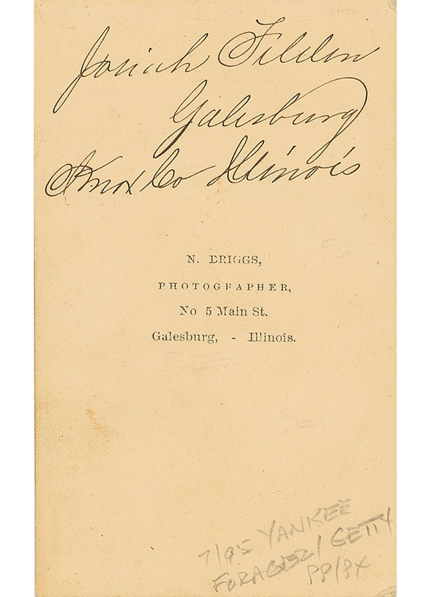 Original 2.25 x 4 carte-de-visite photo of Tilden in uniform by N. Briggs of Galesburg, Illinois, signed on the front “Josiah Tilden,” and again on the reverse in black ink, “Josiah Tilden, Galesburg, Knox Co., Illinois.” In fine condition, with some pencil notations to reverse.