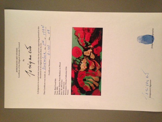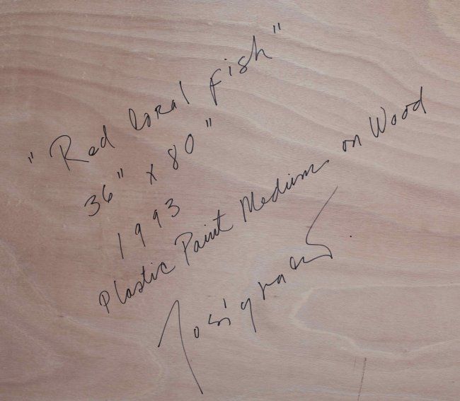 Josignacio, "Red Coral Fish" 1993, Plastic paint medium on wood form abstract Series. Size: 36 inches x 80 inches. Photos are part of the description representing the condition report. Pangaea Auctions urges Bidder's to view all attached photos.