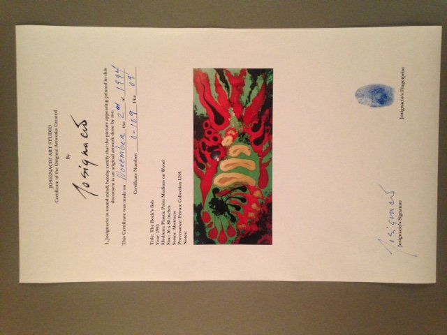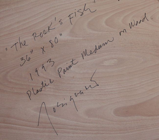 Josignacio, "The Rock's Fish" 1993, Plastic paint medium on wood form abstract Series. Size: 36 inches x 80 inches. Photos are part of the description representing the condition report. Pangaea Auctions urges Bidder's to view all attached photos.
