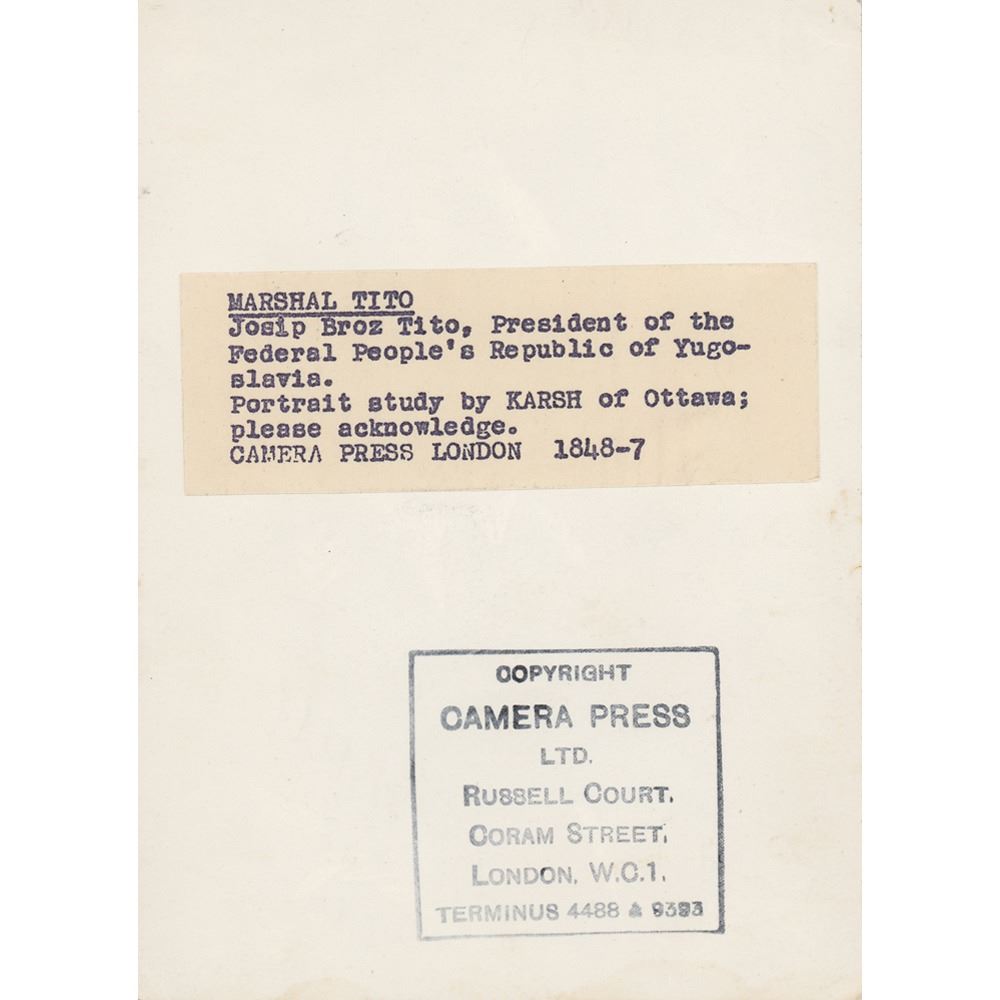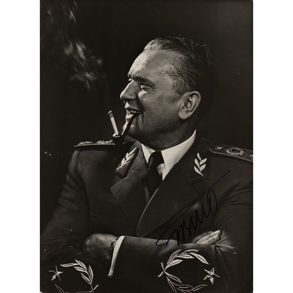 Longtime leader of Yugoslavia (born 1892) from 1945 until his death in 1980. Humorous vintage glossy 4.75 x 6.5 photo of Tito playfully smoking a cigarette through a pipe, signed in fountain pen. Reverse bears a Yousuf Karsh credit caption and a Camera Press copyright stamp. In fine condition.