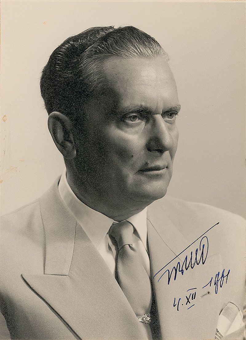 Longtime leader of Yugoslavia (born 1892) from 1945 until his death in 1980. Vintage matte-finish 5 x 7 portrait of Tito, signed in fountain pen and dated December 4, 1961. Affixed to its original presentation mat to an overall size of 7.25 x 9.5. Some light soiling to borders, photo beginning to detach from mat, and a couple creases to the mat, otherwise fine condition. Accompanied by the original transmittal slip from Tito’s office.