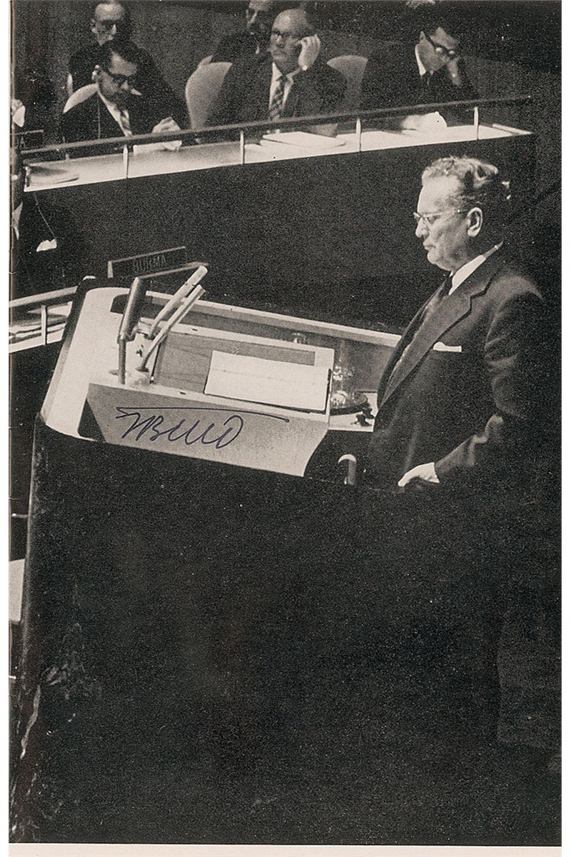 Longtime leader of Yugoslavia (born 1892) from 1945 until his death in 1980. Booklet entitled ‘President Tito’s Address to the United Nations,’ 5.5 x 8.5, 30 pages, September 1960, signed inside in black ink on a light area of a full-page image taken during the speech. Accompanied by a transmittal slip from Tito’s office.