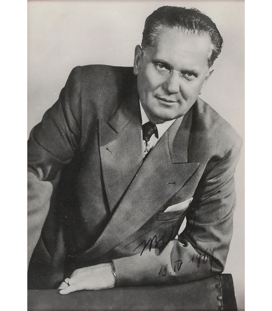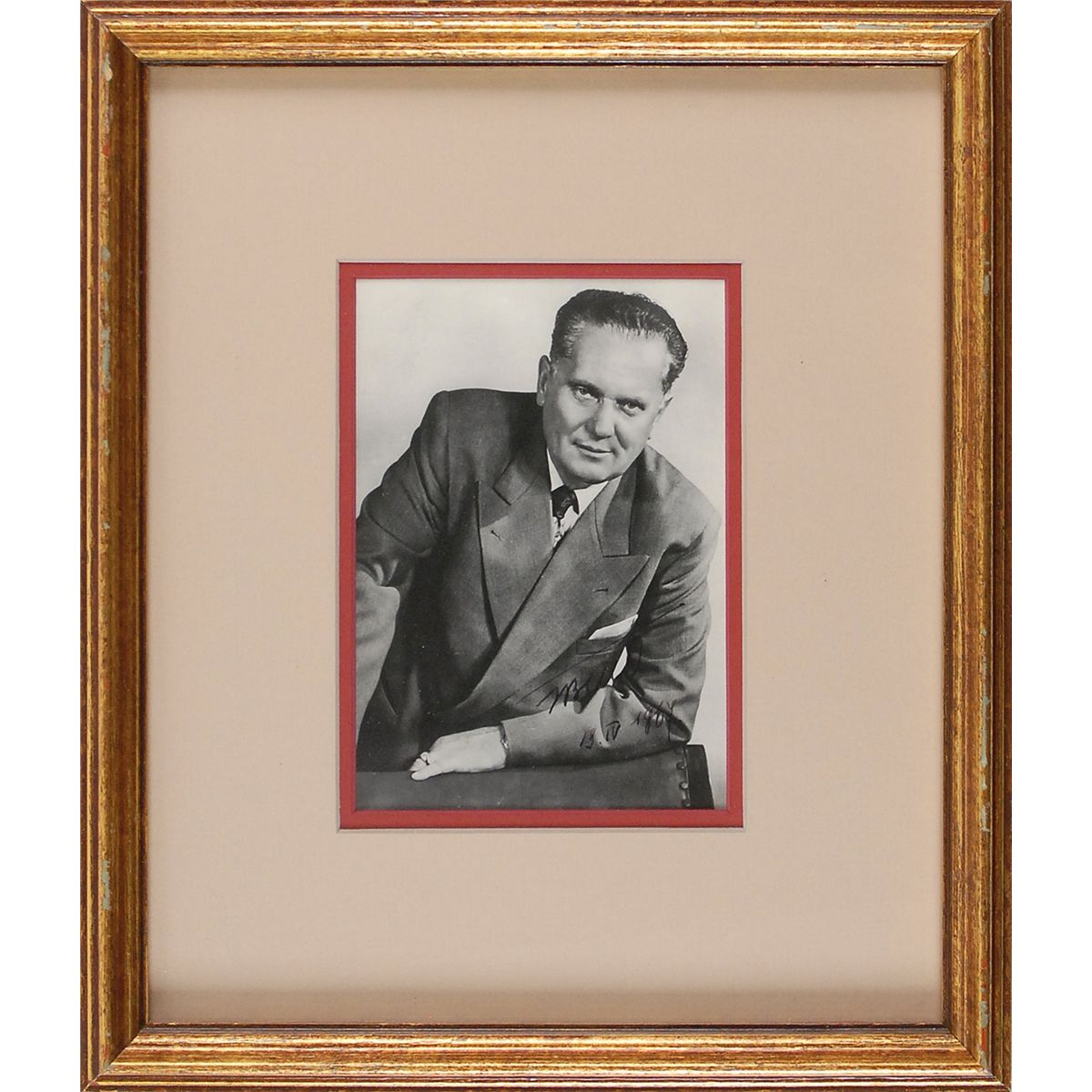 Longtime leader of Yugoslavia (born 1892) from 1945 until his death in 1980. Semi-glossy 3.75 x 5.25 photo of Tito leaning forward on his left arm, signed in fountain pen and dated April 13, 1964. Double-matted and framed to an overall size of 9.5 x 11. Scattered surface impressions and some light contrast to signature against his dark jacket, otherwise fine condition.