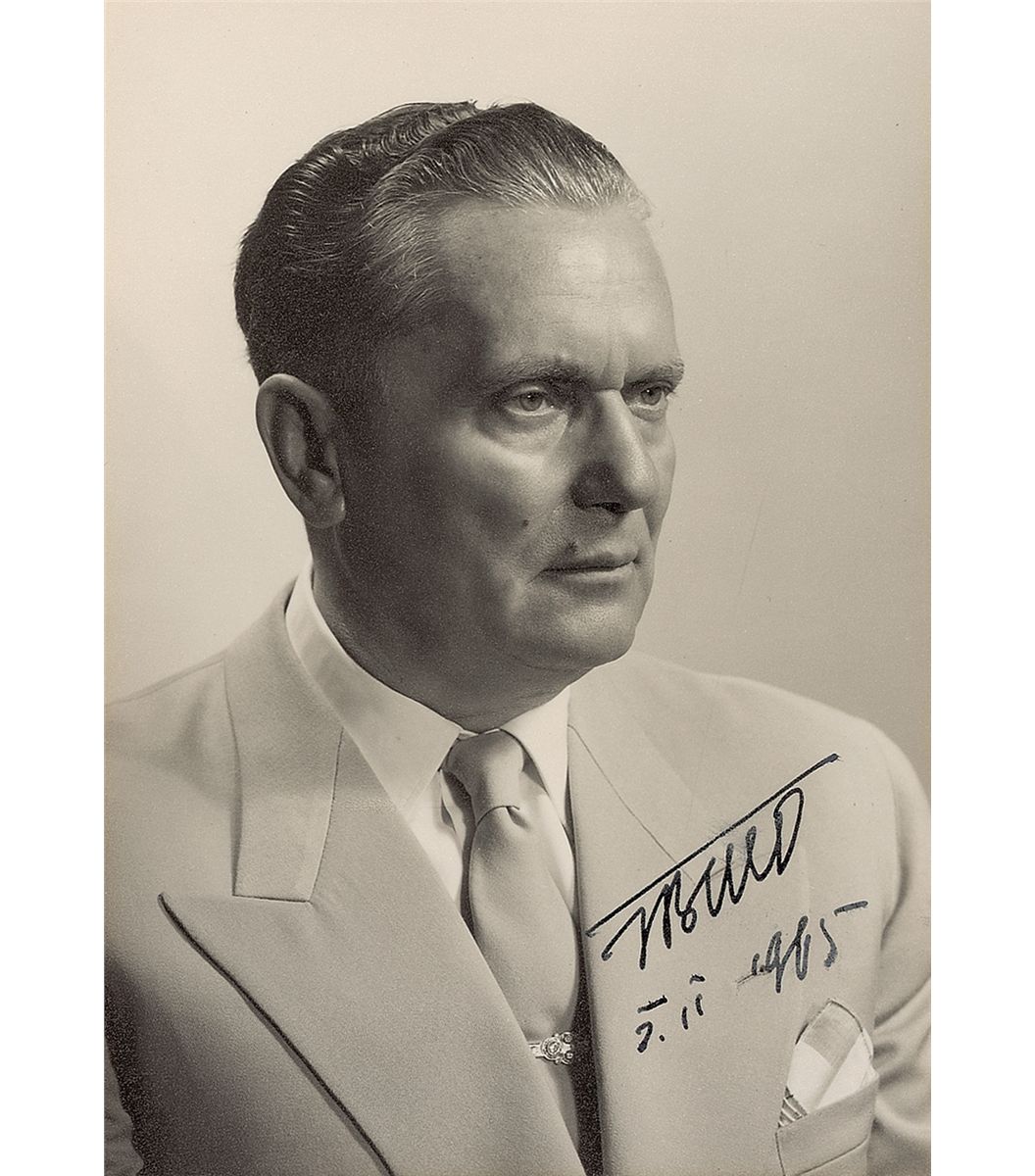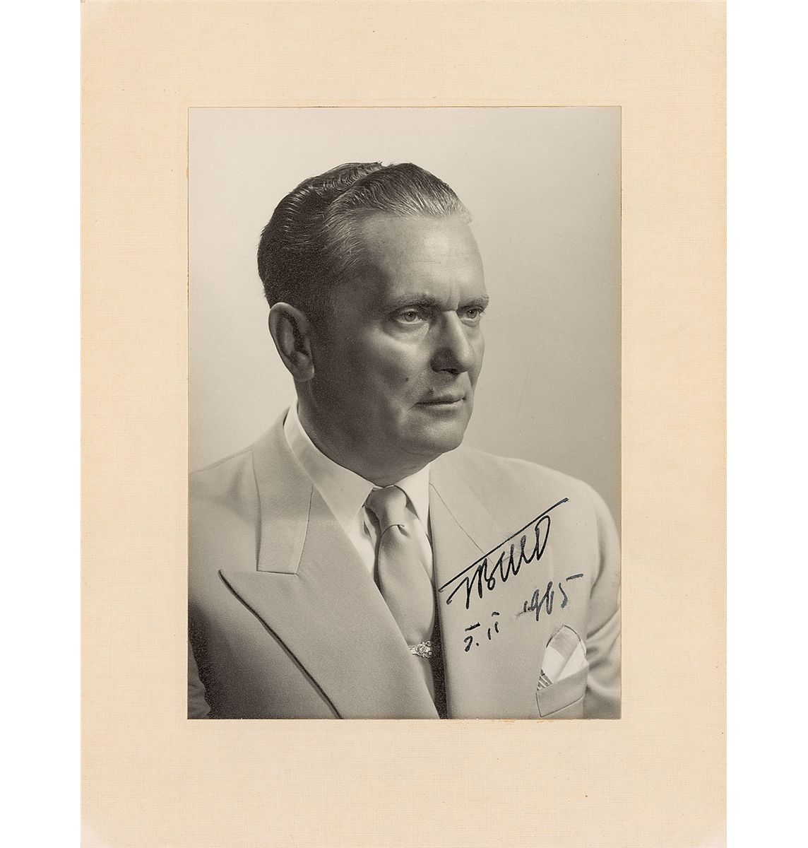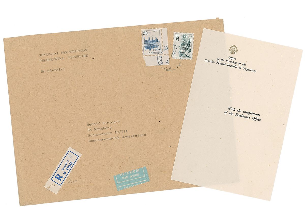 Longtime leader of Yugoslavia (born 1892) from 1945 until his death in 1980. Crystal-clear matte-finish 4.75 x 6.75 photo of Tito in a suit and tie, affixed to its original 7.25 x 9.5 mount, boldly signed in fountain pen and dated 1965. In fine condition, with slight brushing to ink. Accompanied by the original mailing envelope and printed transmittal slip from his office.