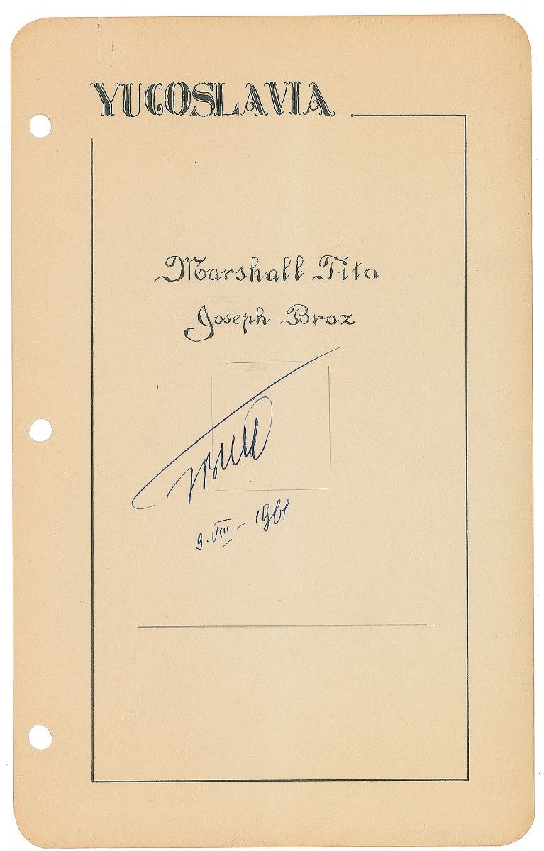 Longtime leader of Yugoslavia (born 1892) from 1945 until his death in 1980. Fountain pen signature of Tito dated August 9, 1961, on an off-white 6 x 9.5 sheet hand-embellished with a calligraphic title. In fine condition.