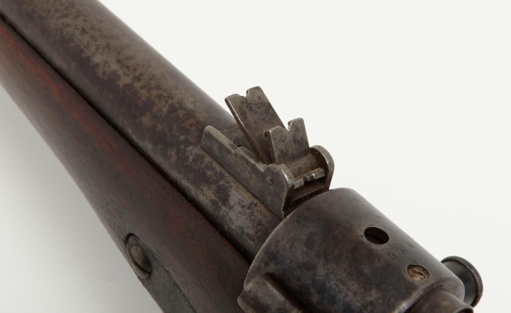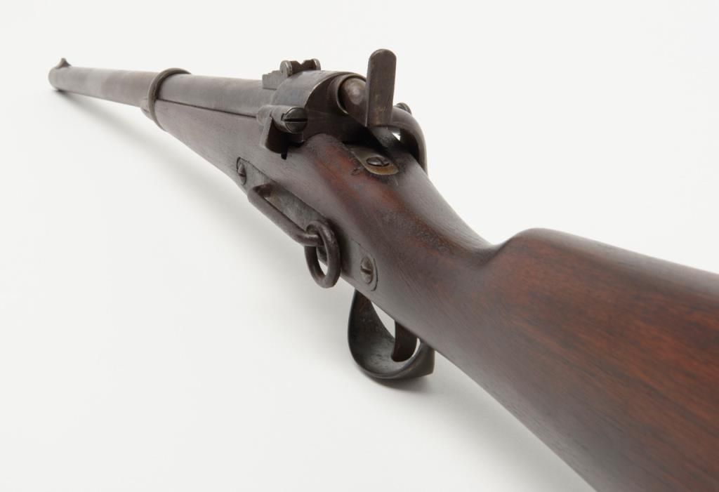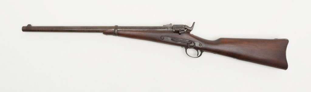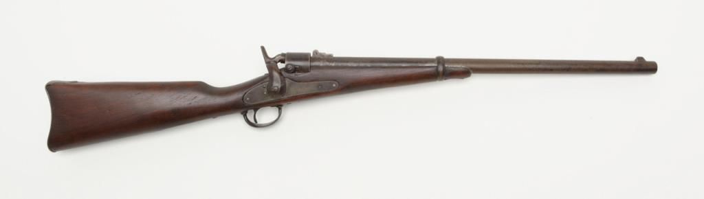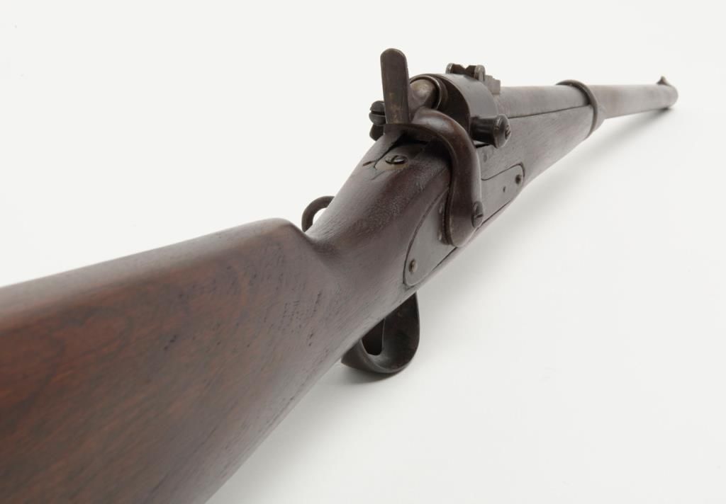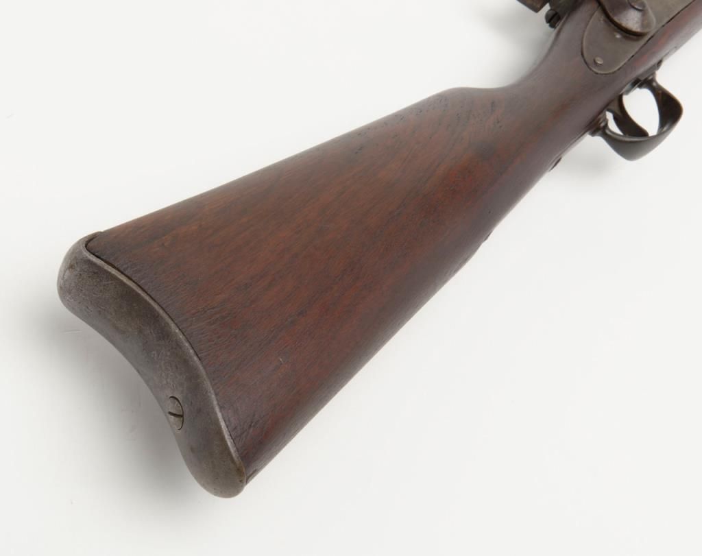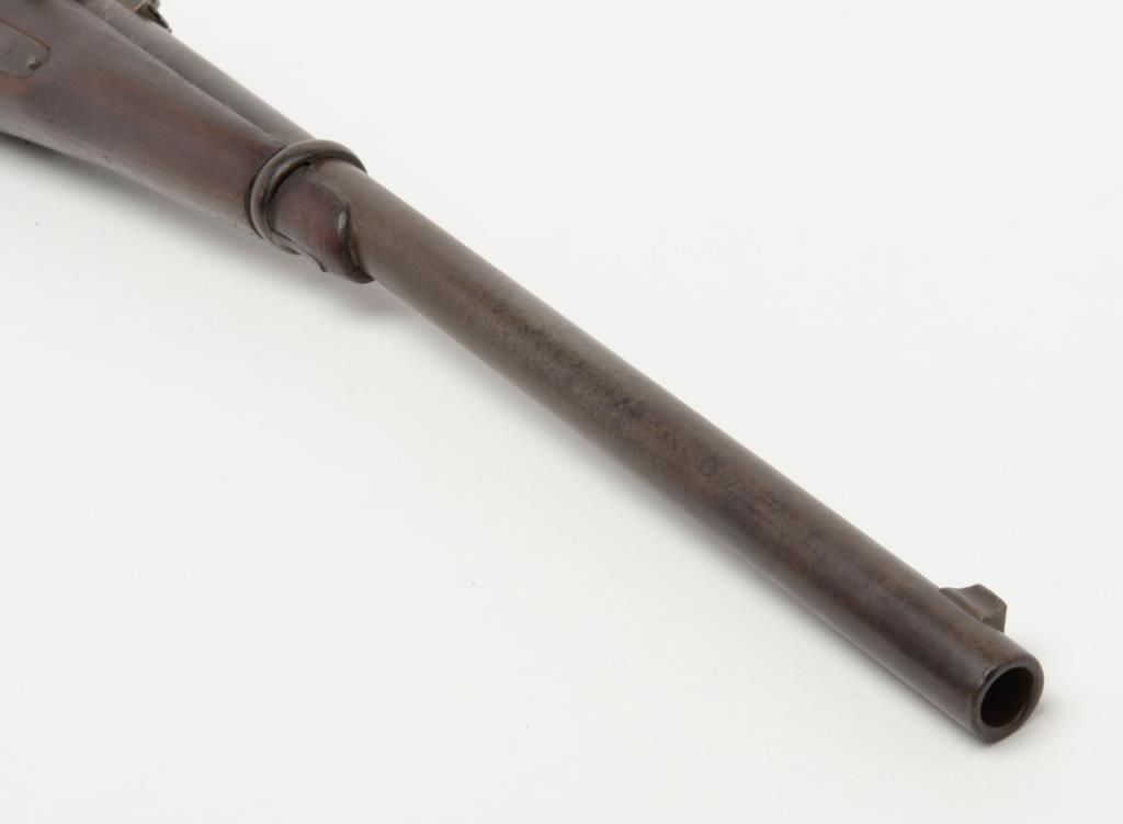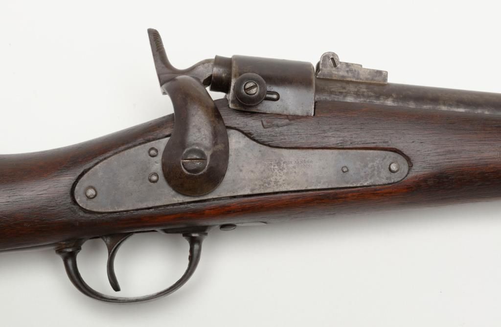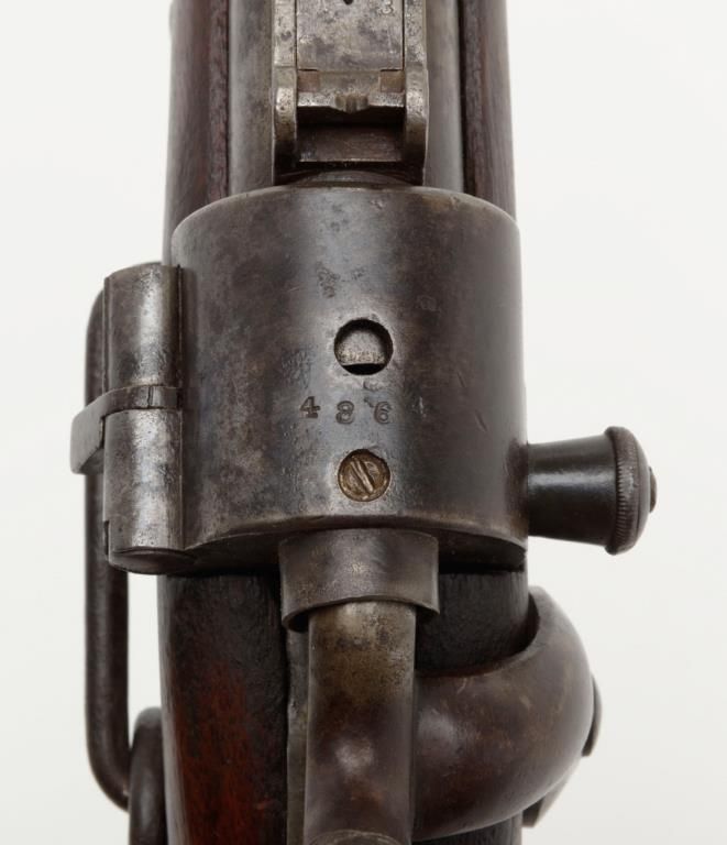 Joslyn Model 1864 SRC, .52RF cal., 22” barrel, iron mountings, wood stock, #4864 in overall very good condition showing a dark patina on metal surfaces with scattered areas of erosion, crisp action, very good + bore, good markings onlockplate, traces of case color on protected areas of interior, good stock showing possible old re-finish; no visible inspector cartouches as likely a private purchase; a nice honest Joslyn. Per Flayderman’s, this Model experienced aproduction of only 12,500 (8,000 purchased by the Government, 4,500 private sales). (Antique). Est.: $900-$1,800.
