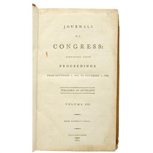 <B>Journal of Congress Containing Their Proceedings From November 5, 1787, to November 3, 1788, Volume XIII </B></I> (Philadelphia, Folwell’s Press, 1801), 192 pages, with index, 8vo, original calf covers, no jacket. Ex libris, rubbed, corners worn, text clean with light foxing. Front cover loose, else good.<BR><BR><BR><b>Shipping:</b> Books & Catalogs (<a target="_blank" href="http://www.heritageauctions.com/common/shipping.php">view shipping information</a>)