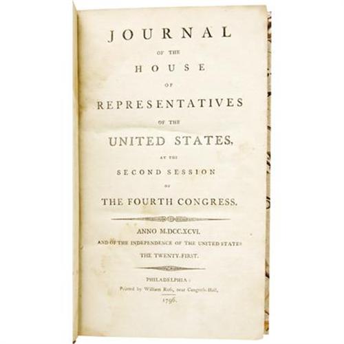 <B><I>Journal of the House of Representatives of the United States, at the Second Session of the Fourth Congress</B></I></B></I> (Philadelphia: William Ross, 1796), first edition, 299 pages plus Index, marbled paper boards shelf backed in modern leather with gilt spine titles, 8vo (5" x 8.25"). Included in this volume is Washington's 1796 address to Congress, information on the election of 1796, the creation of Washington D. C. as the nation's capital, and many, many other national concerns. Very good condition.<BR><BR><b>Shipping:</b> Books & Catalogs (<a target="_blank" href="http://www.heritageauctions.com/common/shipping.php">view shipping information</a>)