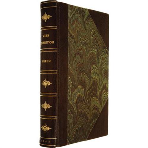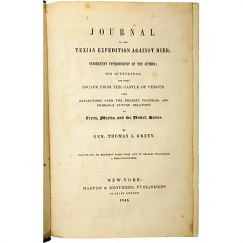 <B>Thomas J. Green: </B></I><B><I>Journal of the Texian Expedition Against Mier;</B></I></B></I> <I>Subsequent Imprisonment of the Author; His Sufferings, and Final Escape from the Castle of Perote. With Reflections Upon the Present Political and Probable Future Relations of Texas, Mexico, and the United States. By Gen. Thomas J. Green. Illustrated by drawings taken from life by Charles M'Laughlin, a Fellow-Prisoner. </B></I>(New York: Harper & Brothers, 1845). First edition. Octavo, 8.5" x 5.5". xiv, [15-17] 18-487 pages. Illustrated with eleven plates, including two plans (one of them folding), and with one of the plates used as a frontispiece. Handsomely bound in modern half brown morocco over marbled paper boards, spine in six compartments with five raised bands and lettered and tooled in gilt. Sprinkled edges. Green's first-hand account of the expedition against Mier, and the ensuing tragedy. Green and others led a retaliatory attack against Mier on the Rio Grande in 1842 and after failing were taken prisoner. The author describes the expedition, his imprisonment and eventual escape. Occasional light foxing and soiling, especially to the tissue guards and plates. A few small spots of soiling to the edges, else a very good copy. <I>From the collection of Darrel Brown.</B></I><BR><BR><B>Reference:</B></I> Sabin 28562. <I>Basic Texas Books</B></I> 80. Dobie, page 55. Graff 1643. Streeter <I>Texas</B></I> 1581. Howes G371.<BR><BR><b>Shipping:</b> Books & Catalogs (<a target="_blank" href="http://www.heritageauctions.com/common/shipping.php">view shipping information</a>)