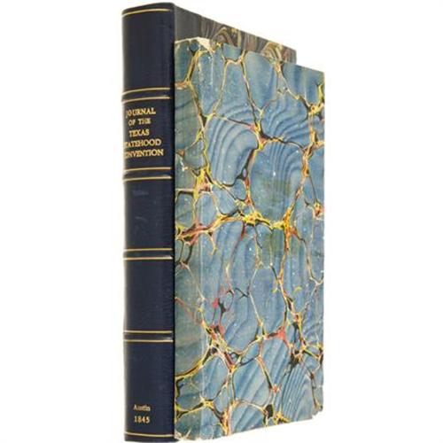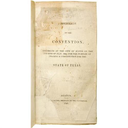<B><I>Journals of the Convention, Assembled at the City of Austin on the Fourth of July 1845, for the Purpose of Framing a Constitution for the State of Texas.</B></I></B></I> Austin: Miner & Cruger, Printers to the Convention, 1845, 378 p., 8vo, with modern marbled wrappers. First edition, this being Thomas W. Streeter's personal copy with leaf of notes laid in. Second only in importance to the convention that drafted the Texas Declaration of Independence and the Constitution of the Republic of Texas (March 1836), this convention adopted the first Constitution of the State of Texas. It is one of the most indispensable sources of Texas history. <BR><BR>Considered the most able body of its kind to ever be assembled in Texas, the 1845 convention included such learned and politically experienced individuals as James Pinckney Henderson, Isaac Van Zandt, Hardin R. Runnels, Abner S. Lipscomb, Nicholas H. Darnell, R. E. B. Baylor, Jose Antonio Navarro, Thomas Jefferson Rusk, who was elected president of the convention, and James H. Raymond who was named secretary. By a vote of fifty-five to one, the delegates approved the offer of annexation. Subsequently, the convention prepared the Constitution of 1845 for the new state. Housed in a contemporary half-calf case with marbled covers, gilt lettering. Pages 371-4 missing, but photostatic copies have been laid in; a number of leaves have been washed and remargined. A few sections of minor age toning and foxing, else fine. <I>From the collection of Darrel Brown.</B></I><BR><BR><B>Reference:</B></I> Streeter <I>Texas</B></I> 638 (locating 12 copies, 3 of which are defective), Streeter's personal copy. Eberstadt, <I>Texas</B></I> 162:45 (this copy). Raines, p. 231. Sabin 94978. This is the copy Donated to the Texas State Historical Association by Shirley and Clifton Caldwell.<BR><BR><b>Shipping:</b> Books & Catalogs (<a target="_blank" href="http://www.heritageauctions.com/common/shipping.php">view shipping information</a>)