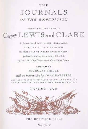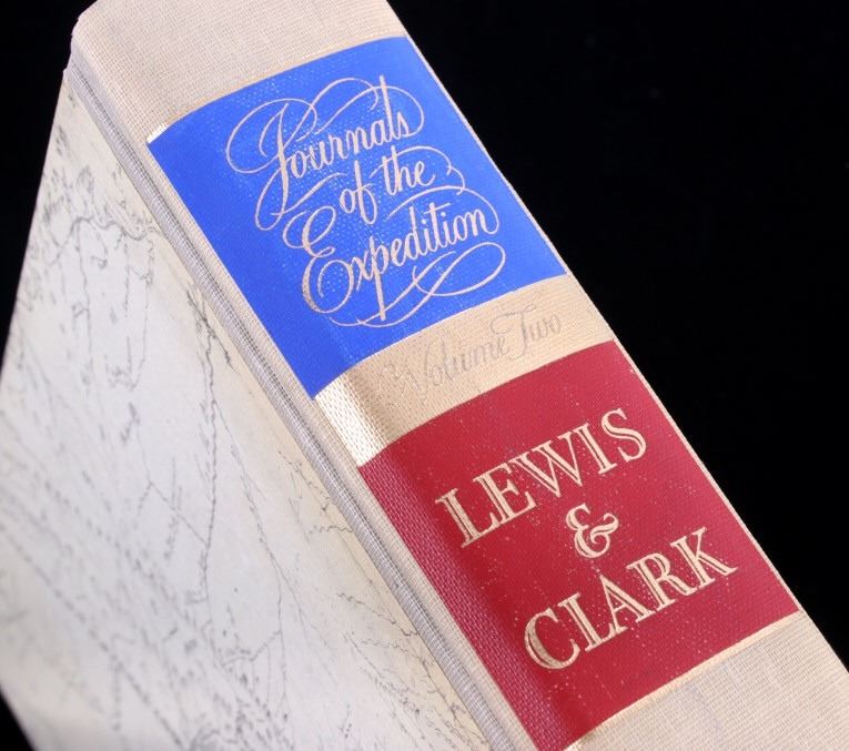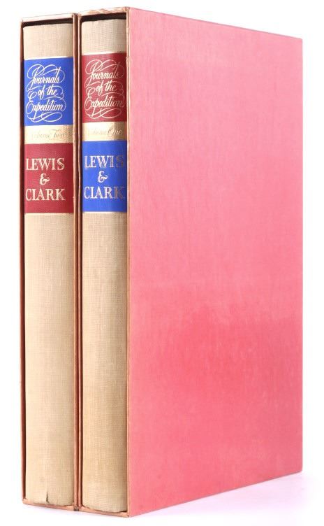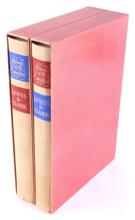 This edition of Lewis and Clark's Expedition diaries includes a multitude of illustrations, drawings, maps, and facsimiles in both color and sepia-tone throughout two volumes. The introduction was written by John Bakeless, who has written over a dozen books, including "Lewis and Clark, Partners in Discovery", which is one of the first and foremost scholarly works on Meriwether Lewis and William Clark. This edition also includes sixteen full-page plates in four, five, and six colors. Thirteen of the plates are from paintings by Carl Bodmer and three paintings by George Bird King. They are bound in decorated parchment-toned buckram with a map design in sepia and buckram spine labels hand-lettered and stamped in pure gold leaf. They are on the original slipcase. They measure 12" x 8.25".
