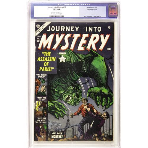 <B>Journey Into Mystery #10 White Mountain pedigree (Marvel, 1953) CGC VF+ 8.5 Off-white to white pages.</B></I> This is one of only two copies on CGC's current census, and it's from that ever-reliable source of tough pre-Code horror books, the White Mountain collection. The book has a Russ Heath cover and art by Jack Abel and Jerry Robinson (yes, <I>that</B></I> Jerry Robinson). Overstreet 2006 VF 8.0 value = $340; VF/NM 9.0 value = $533. CGC census 12/06: 1 in 8.5, none higher.<BR><BR><b>Shipping:</b> Slabbed Comic (<a target="_blank" href="http://www.heritageauctions.com/common/shipping.php">view shipping information</a>)