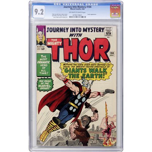 <B>Journey Into Mystery #104 (Marvel, 1964) CGC NM- 9.2 Off-white to white pages.</B></I> When Surtur isn't the most evil guy on a cover, you know Thor is going to have his godlike hands full! Jack Kirby drew the Asgardian action. Overstreet 2006 NM- 9.2 value = $290. CGC census 3/07: 6 in 9.2, 6 higher.<BR><BR><b>Shipping:</b> Comics - Slabbed (certified) (<a target="_blank" href="http://www.heritageauctions.com/common/shipping.php">view shipping information</a>)