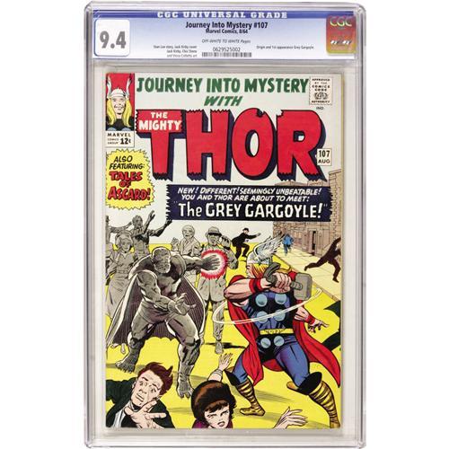 <B>Journey Into Mystery #107 (Marvel, 1964) CGC NM 9.4 Off-white to white pages.</B></I> The origin and first appearance of the Grey Gargoyle and the first appearance of Karnilla make this issue a standout, but the Jack Kirby cover and art is the deal-maker. Overstreet 2006 NM- 9.2 value = $290. CGC census 3/07: 10 in 9.4, none higher.<BR><BR><b>Shipping:</b> Comics - Slabbed (certified) (<a target="_blank" href="http://www.heritageauctions.com/common/shipping.php">view shipping information</a>)