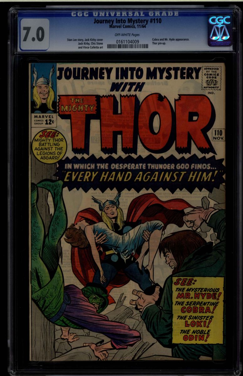 Journey Into Mystery #110 CGC 7.0 off-white pages. Stan Lee story Jack Kirby cover, Jack Kirby Chic Stone and Vince Colletta art. Thor pin-up. Cobra and Mr. Hyde appearance. Overstreet 2009 FN 6.0 value = $54, VF 8.0 value = $130. CGC census: 8 at 7.0, 55 higher.