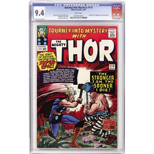 <B>Journey Into Mystery #114 (Marvel, 1965) CGC NM 9.4 White pages.</B></I> One of Thor's best battles was his fight with the Absorbing Man, who makes his first appearance here! Readers also found out the origin of the villain in this ish. Jack Kirby drew the entire book. Overstreet 2006 NM- 9.2 value = $340. CGC census 3/07: 8 in 9.4, 2 higher.<BR><BR><b>Shipping:</b> Comics - Slabbed (certified) (<a target="_blank" href="http://www.heritageauctions.com/common/shipping.php">view shipping information</a>)