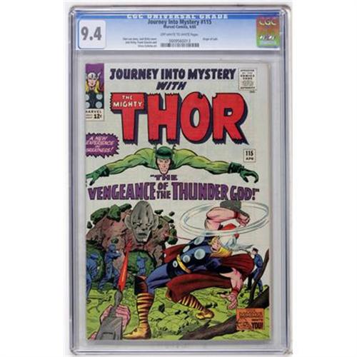 <B>Journey Into Mystery #115 (Marvel, 1965) CGC NM 9.4 Off-white to white pages.</B></I> Sensational copy of a sensational issue that has a detailed origin of Loki. Jack Kirby's cover and story art on this series is stuff of Marvel Age legend. Overstreet 2007 NM- 9.2 value = $320. CGC census 10/07: 7 in 9.4, 3 higher.<BR><BR><b>Shipping:</b> Comics - Slabbed (certified) (<a target="_blank" href="http://www.heritageauctions.com/common/shipping.php">view shipping information</a>)