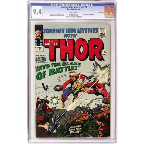 <B>Journey Into Mystery #117 Massachusetts pedigree (Marvel, 1965) CGC NM 9.4 White pages.</B></I> The Enchantress appears in this white-paged pedigree stunner. Jack Kirby contributed the cover and interior art and Vince Colletta art rounds out the book. Overstreet 2006 NM- 9.2 value = $200. CGC census 3/07: 10 in 9.4, 1 higher.<BR><BR><b>Shipping:</b> Comics - Slabbed (certified) (<a target="_blank" href="http://www.heritageauctions.com/common/shipping.php">view shipping information</a>)