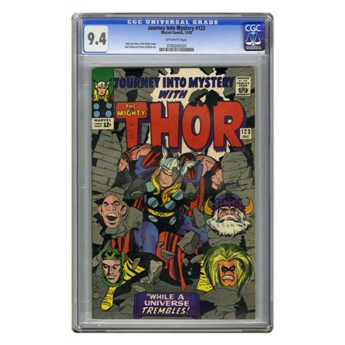 <B>Journey Into Mystery #123 (Marvel, 1965) CGC NM 9.4 Off-white pages.</B></I> Verily, this is one of the nicest copies of this issue yet certified by CGC -- only two top it in the census as of this writing. In addition to the sensational lead story, there's an installment of the epic "Odinsword Quest" storyline in the Tales of Asgard backup feature. Overstreet 2005 NM- 9.2 value = $190. CGC census 12/05: 9 in 9.4, 2 higher.