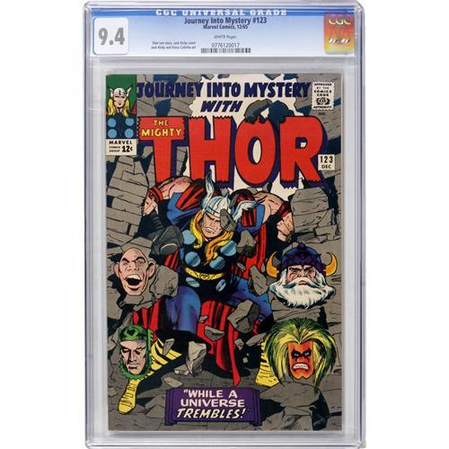 <B>Journey Into Mystery #123 (Marvel, 1965) CGC NM 9.4 White pages.</B></I> An awesome Jack Kirby cover fronts this white page copy that looks as if it came from a pedigree collection. Overstreet 2006 NM- 9.2 value = $200. CGC census 3/07: 13 in 9.4, 3 higher.<BR><BR><b>Shipping:</b> Comics - Slabbed (certified) (<a target="_blank" href="http://www.heritageauctions.com/common/shipping.php">view shipping information</a>)