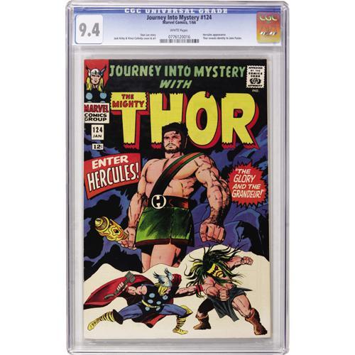 <B>Journey Into Mystery #124 (Marvel, 1966) CGC NM 9.4 White pages.</B></I> While Hercules puts in an appearance, Thor reveals his secret identity to Jane Foster. There is also Tales of Asgard backup feature. Jack Kirby cover and interior art. Overstreet 2006 NM- 9.2 value = $215. CGC census 3/07: 24 in 9.4, 21 higher.<BR><BR><b>Shipping:</b> Comics - Slabbed (certified) (<a target="_blank" href="http://www.heritageauctions.com/common/shipping.php">view shipping information</a>)