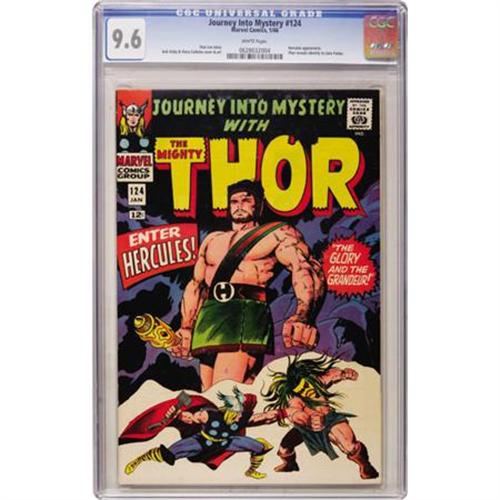<B>Journey Into Mystery #124 (Marvel, 1966) CGC NM+ 9.6 White pages.</B></I> When will a 9.8 copy of this book show up? Until one reaches that Olympian pinnacle, the best copy available would be a white-page 9.6 like this one here! Speaking of Olympians, Hercules appears in this issue. Also, Thor reveals his secret identity to Jane Foster (something he tried back in #113 without much success). Jack Kirby is the artist. Overstreet 2007 NM- 9.2 value = $230. CGC census 6/07: 33 in 9.6, none higher.<BR><BR><b>Shipping:</b> Comics - Slabbed (certified) (<a target="_blank" href="http://www.heritageauctions.com/common/shipping.php">view shipping information</a>)