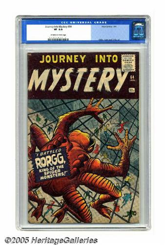 <B>Journey Into Mystery #64 (Marvel, 1961) CGC VF 8.0 Off-white to white pages.</B></I> Jack Kirby cover. Kirby, Steve Ditko, Don Heck, and Paul Reinman art. Overstreet 2005 VF 8.0 value = $136. CGC census 6/05: 2 in 8.0, 1 higher.