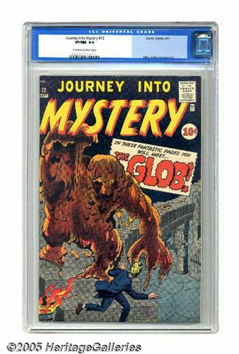 <B>Journey Into Mystery #72 (Marvel, 1961) CGC VF/NM 9.0 Cream to off-white pages.</B></I> "The most <I>fantastic</B></I> and <I>frightening</B></I> experience of my life began so innocently!" says the hero of the Stan Lee/Jack Kirby story "The Glob," in which a painter is hired to paint a weird statue in the middle of Transylvania. For whatever reason, the story was renamed "The Glop" in all subsequent reprints, but no matter what you call it, it's a classic monster mag yarn! There are also two more stories, penciled by Steve Ditko and Paul Reinman respectively. The cover is by "King" Kirby. Overstreet 2005 VF/NM 9.0 value = $208; NM- 9.2 value = $280. CGC census 6/05: 1 in 9.0, 1 higher.